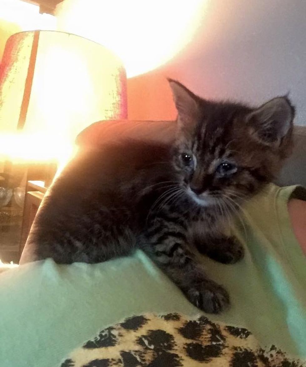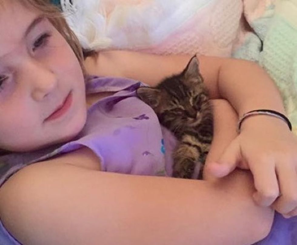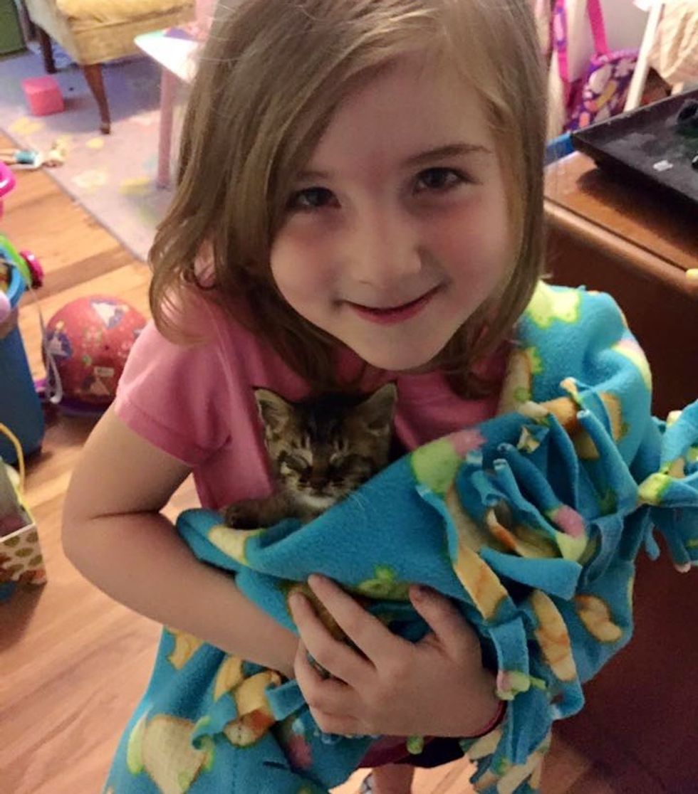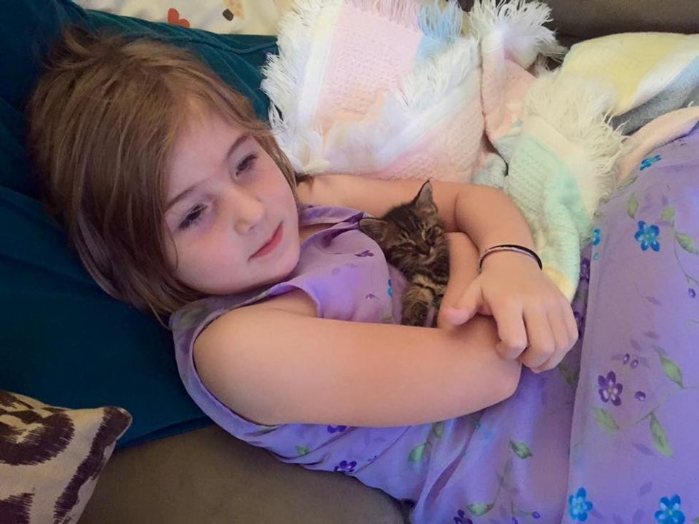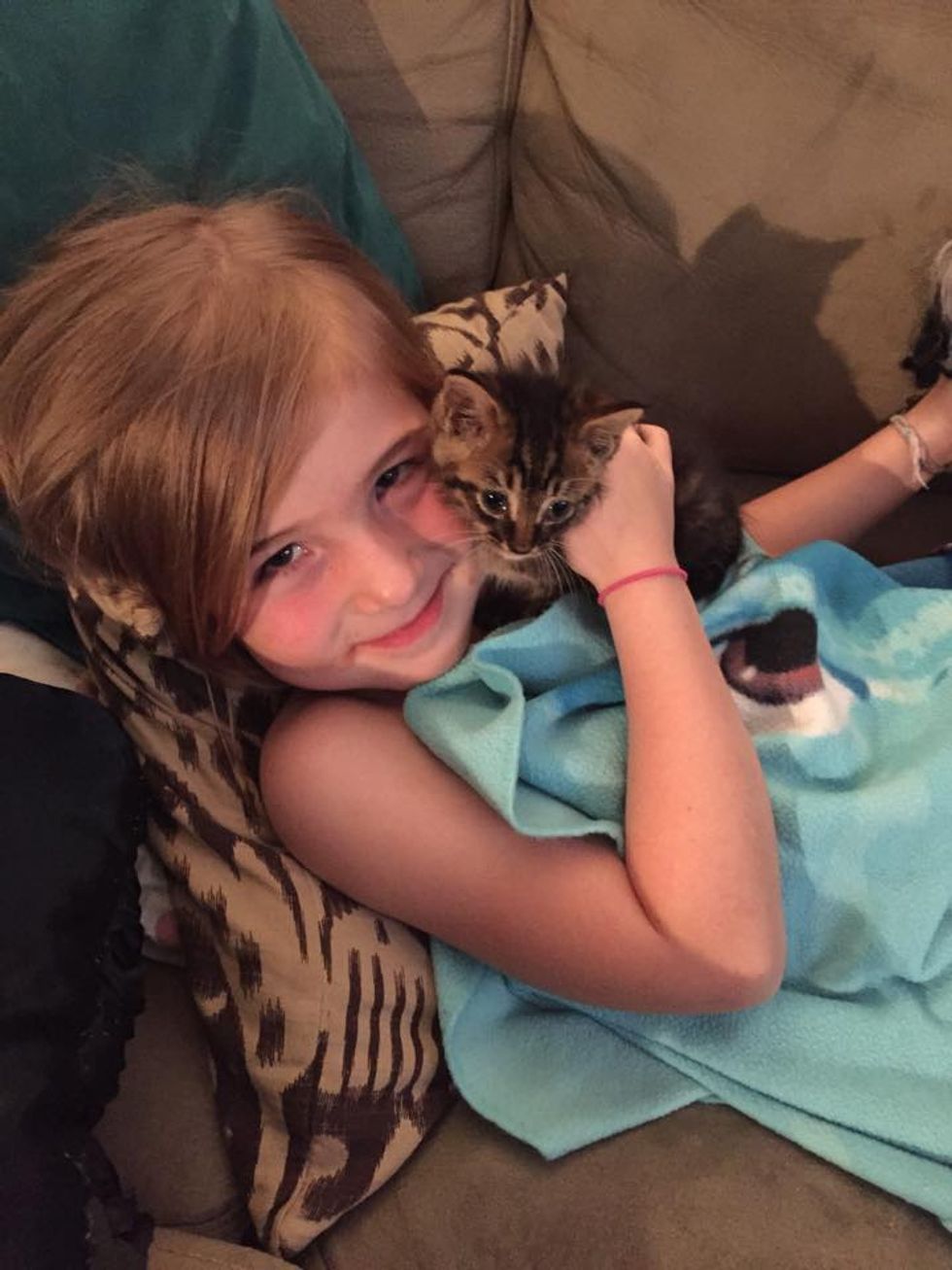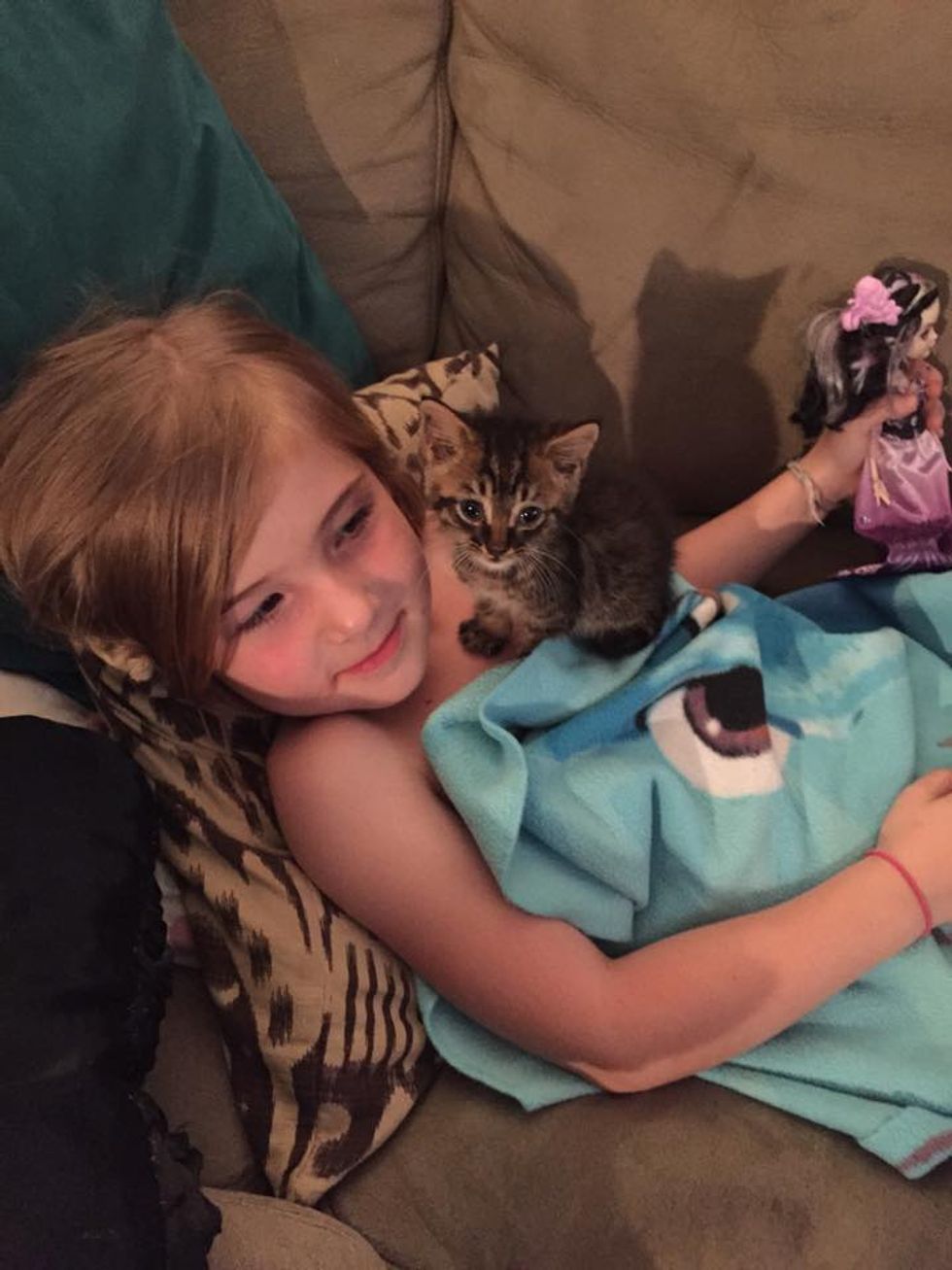Parker, Laney's daughter, offered to help. She stayed with the kitten and kept him in her arms.