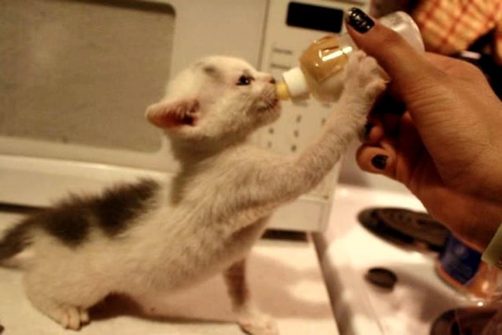 Hungry kitten gets her bottle while her dog papa watches.