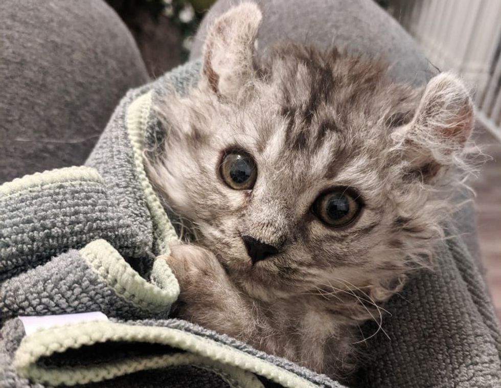 "He was constantly purring and wanting to snuggle. He has curly hair and always looks like a mad scientist when he's playing."