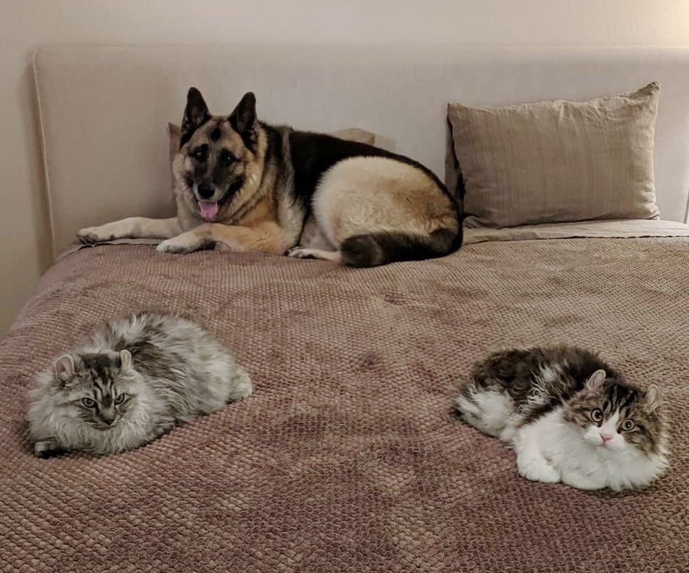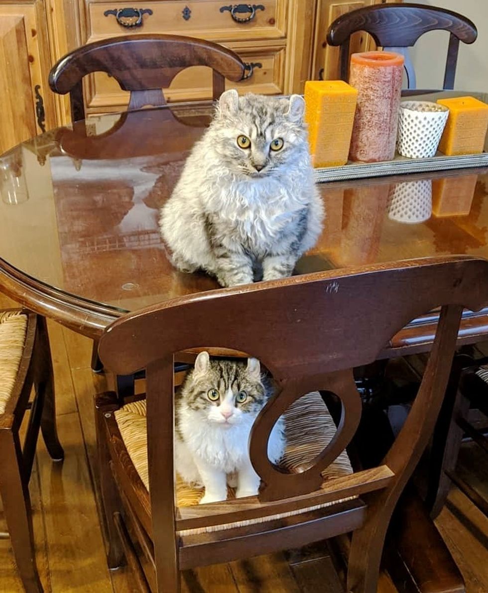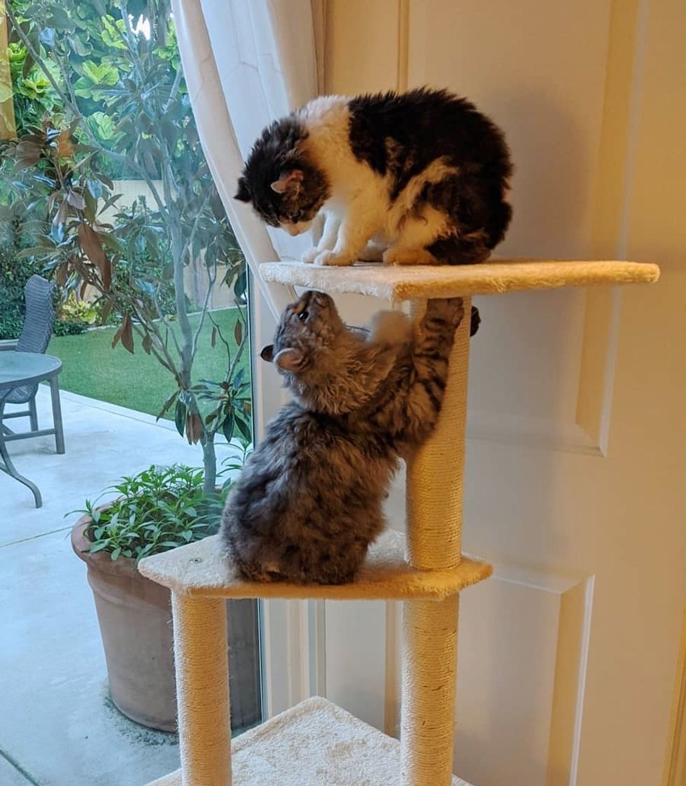 He followed her around the house and climbed the cat tree when she was on top of it. "Amber is so easy going she took to her brother and my resident dog in a day," Denah Hoard, foster mom, told Love Meow.