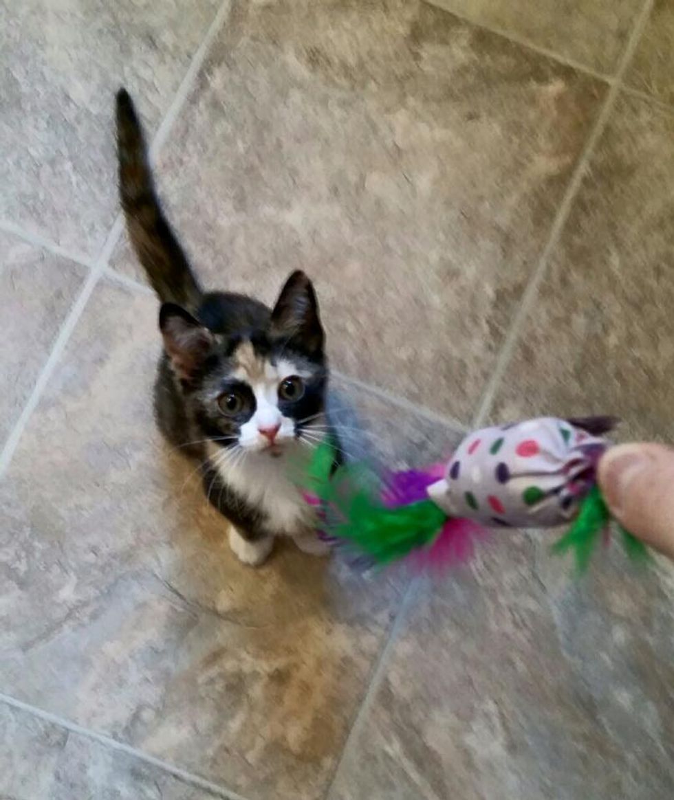 She acted like any other kitten her age despite the tremors, and even learned to use the litter box. Camie discovered that her tail and feet make great toys.