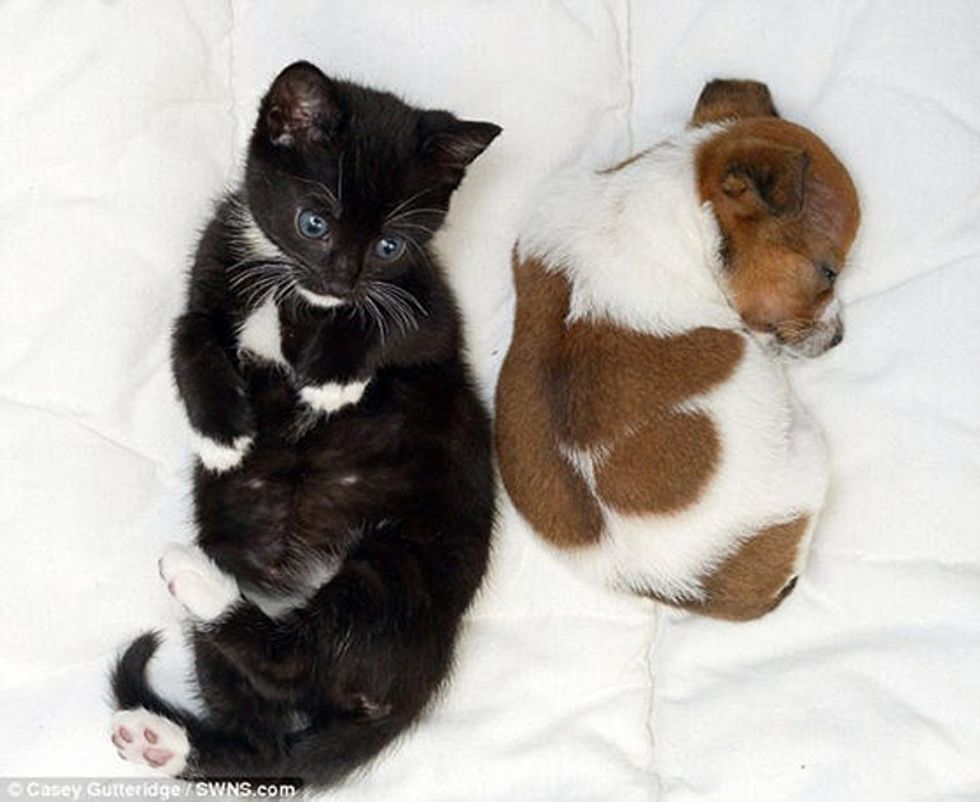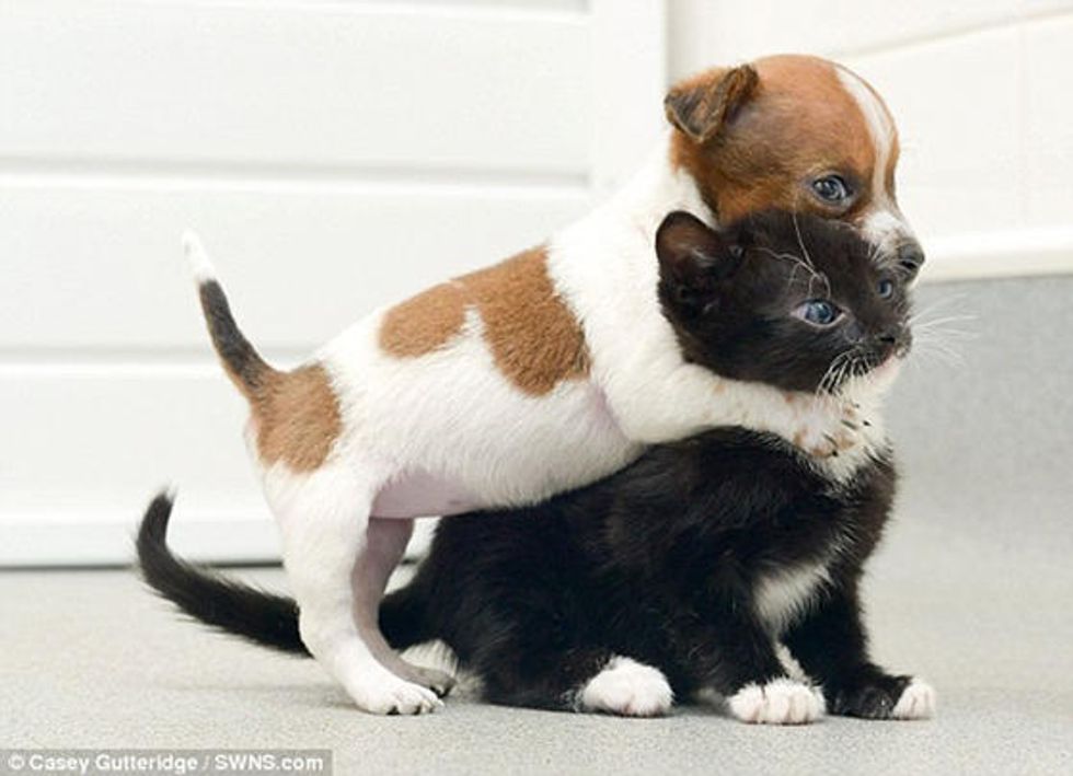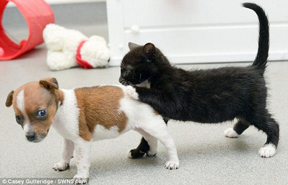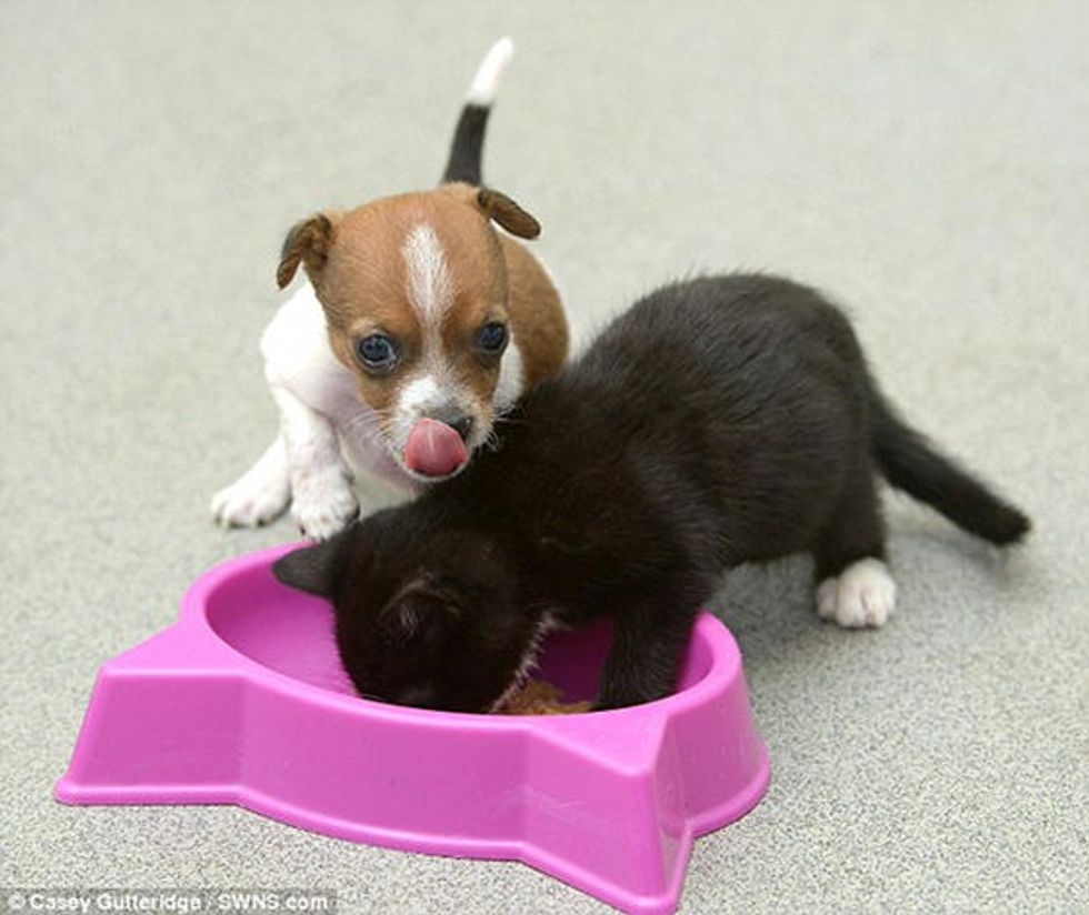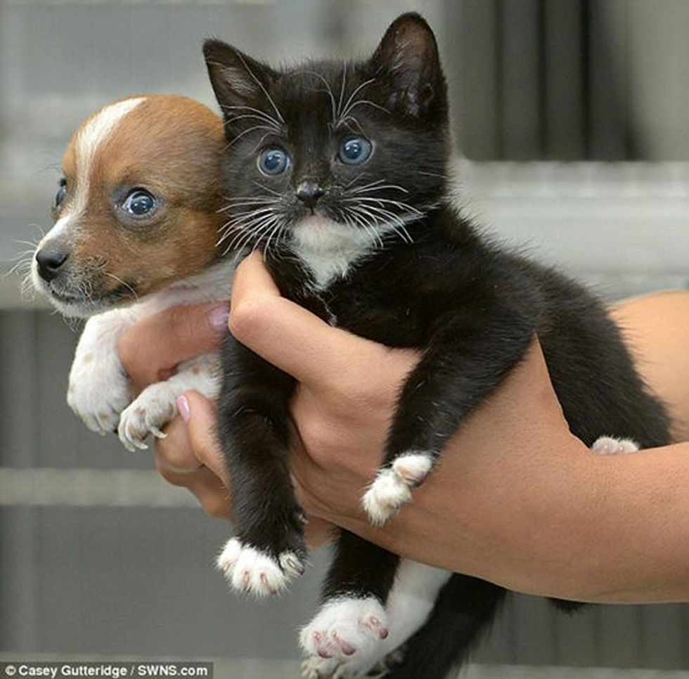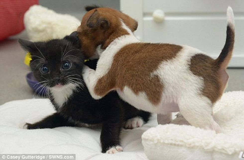 Kitty the cat was brought to Battersea Cats and Dogs Home after she was found in a garden by a kind person. She was only one day old at the time. She was later paired up with Buttons, a Jack Russell who was rejected by her mother as the runt of litter.