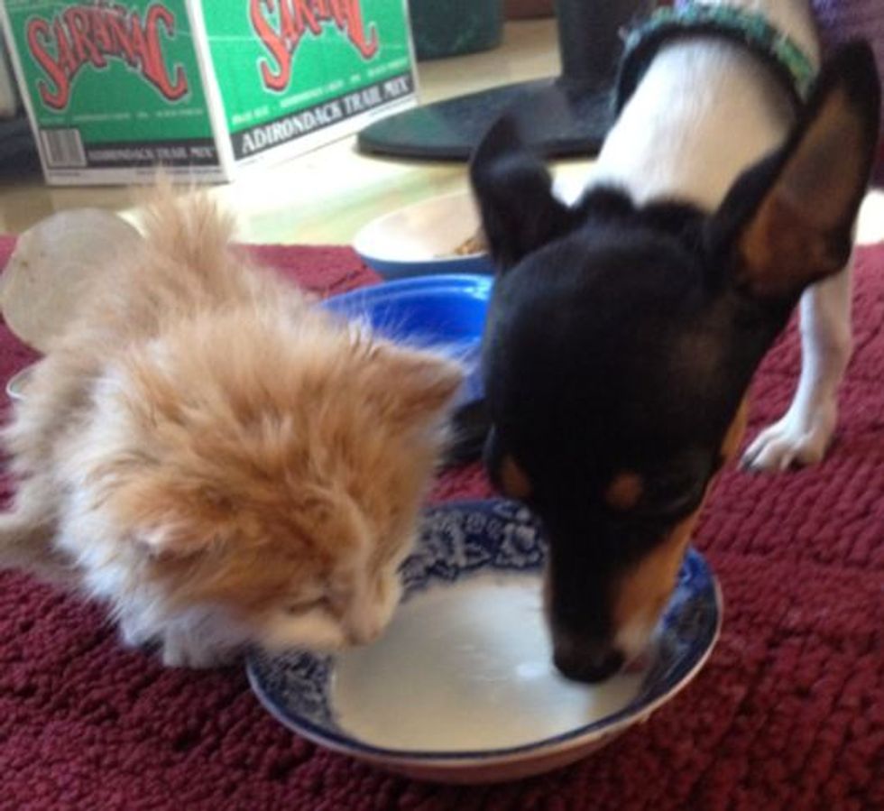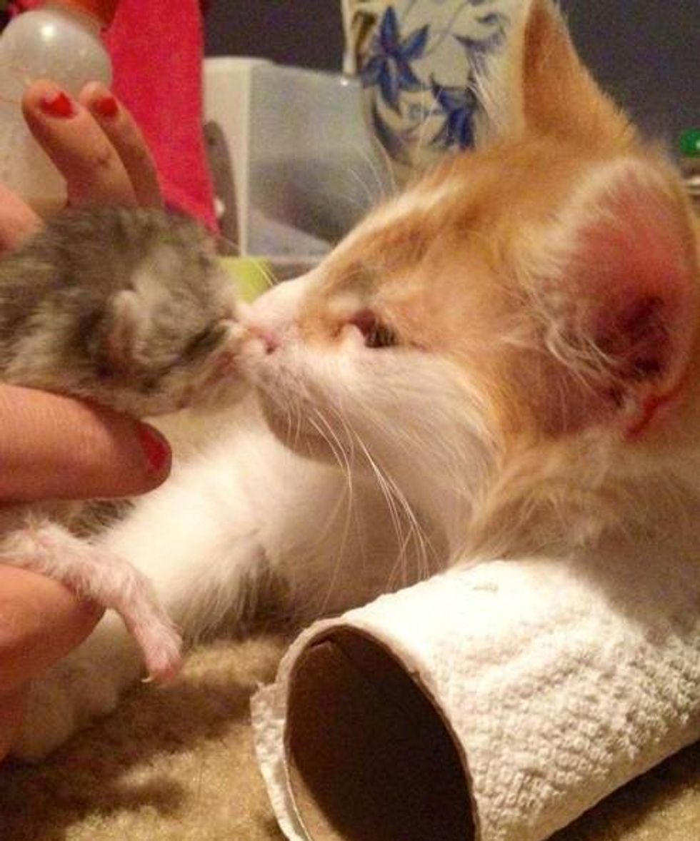 "He's happy and healthy (after a trip to the vet). Growing into a big, bouncing boy," said Em, Roo's new mom. "He is actually 'big brothering' another litter of rescued kittens at the moment," and Roo is giving those kittens the motherly love he never had until he found his forever home.