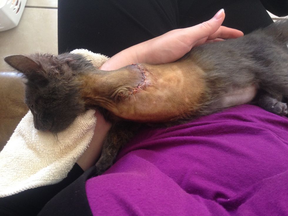 Coriander was able to move around but he had to drag his arm wherever he went. "His leg was getting in his way and holding him back from moving freely. After meeting with a couple of vets, the decision was made to amputate his entire arm."