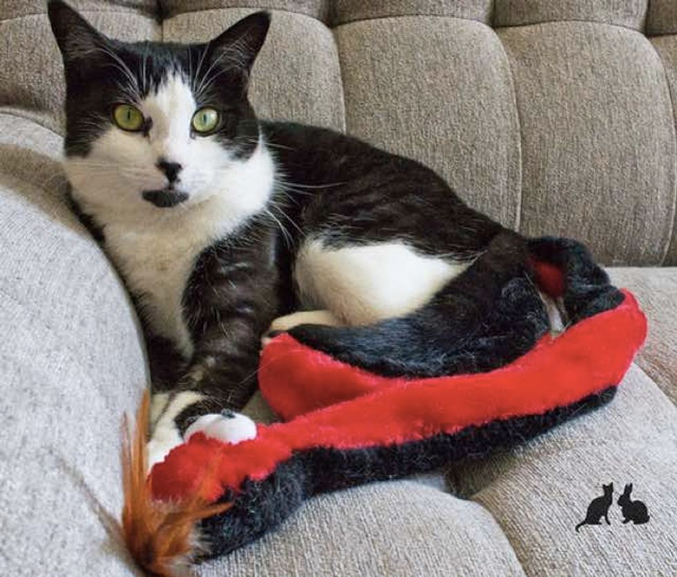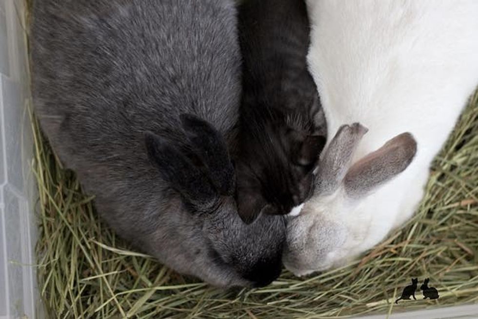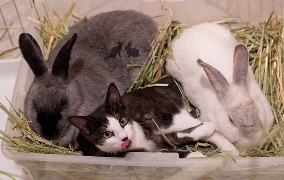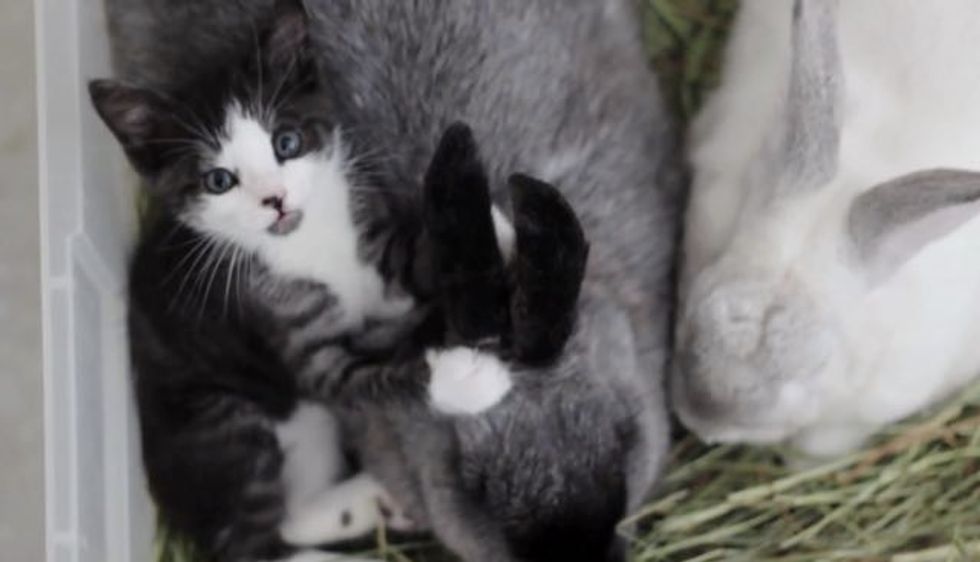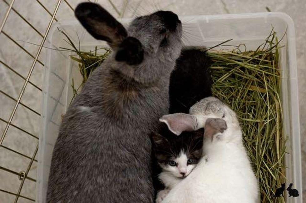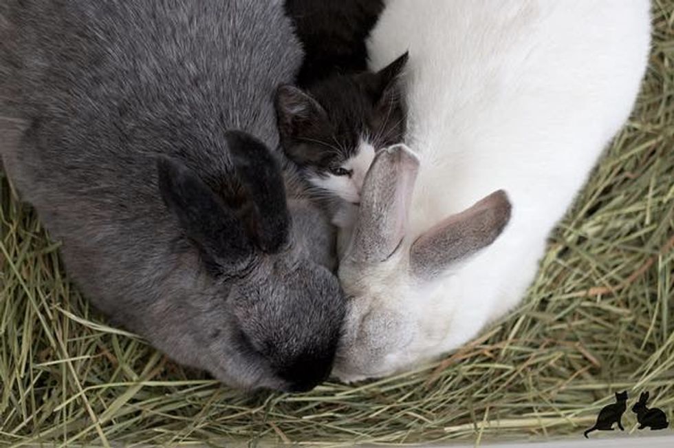Marlowe and Melba the rabbits adore their little feline baby. When they first met, Marlowe immediately took to the little tuxedo kitten and snuggled up to her to keep her company. He was very protective of Mia that the family eventually adopted her because they simply couldn't separate them.