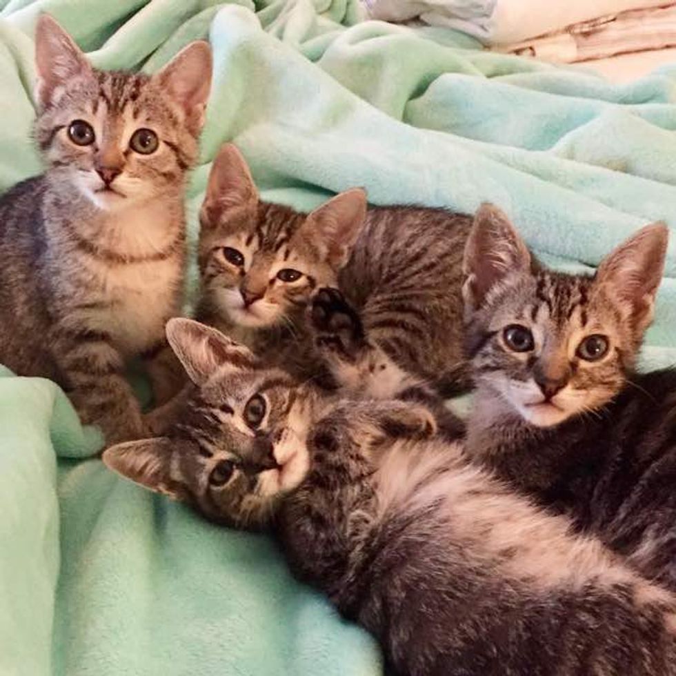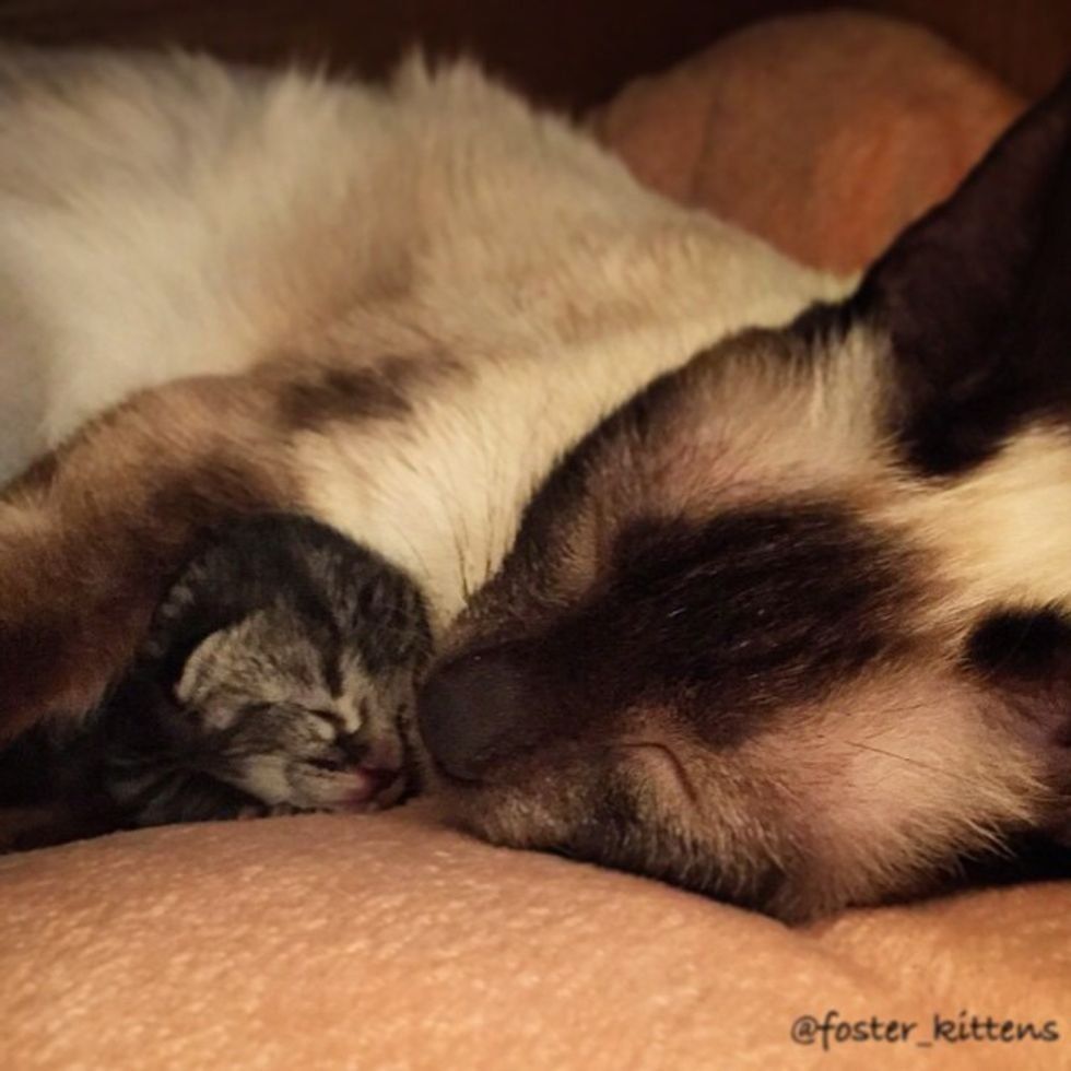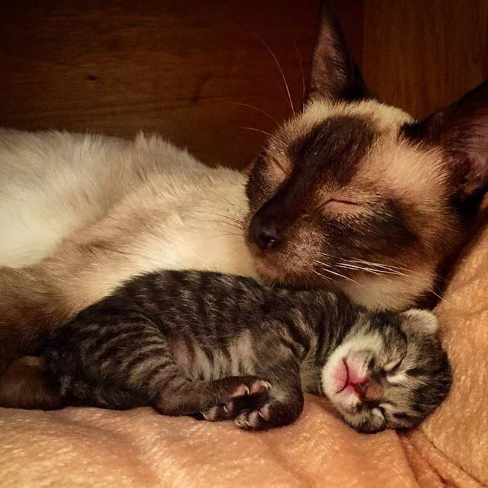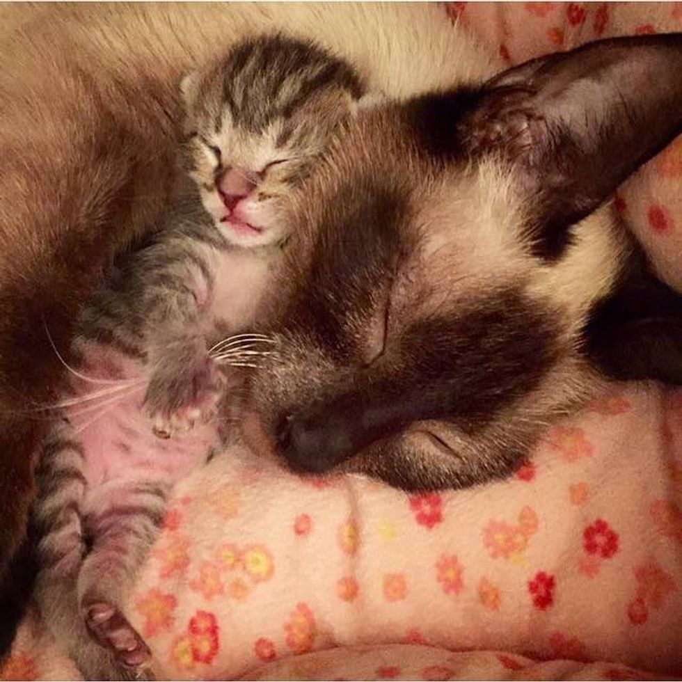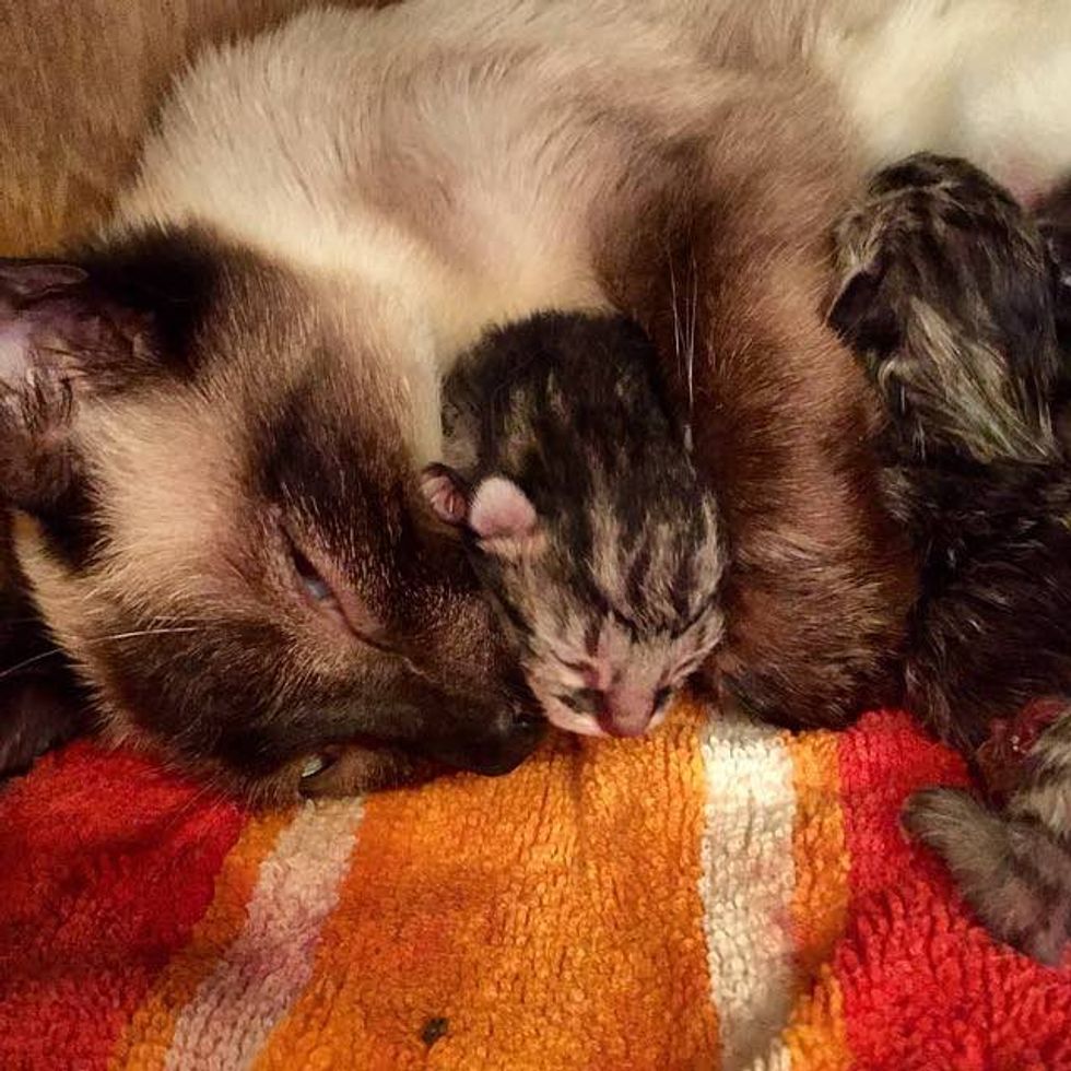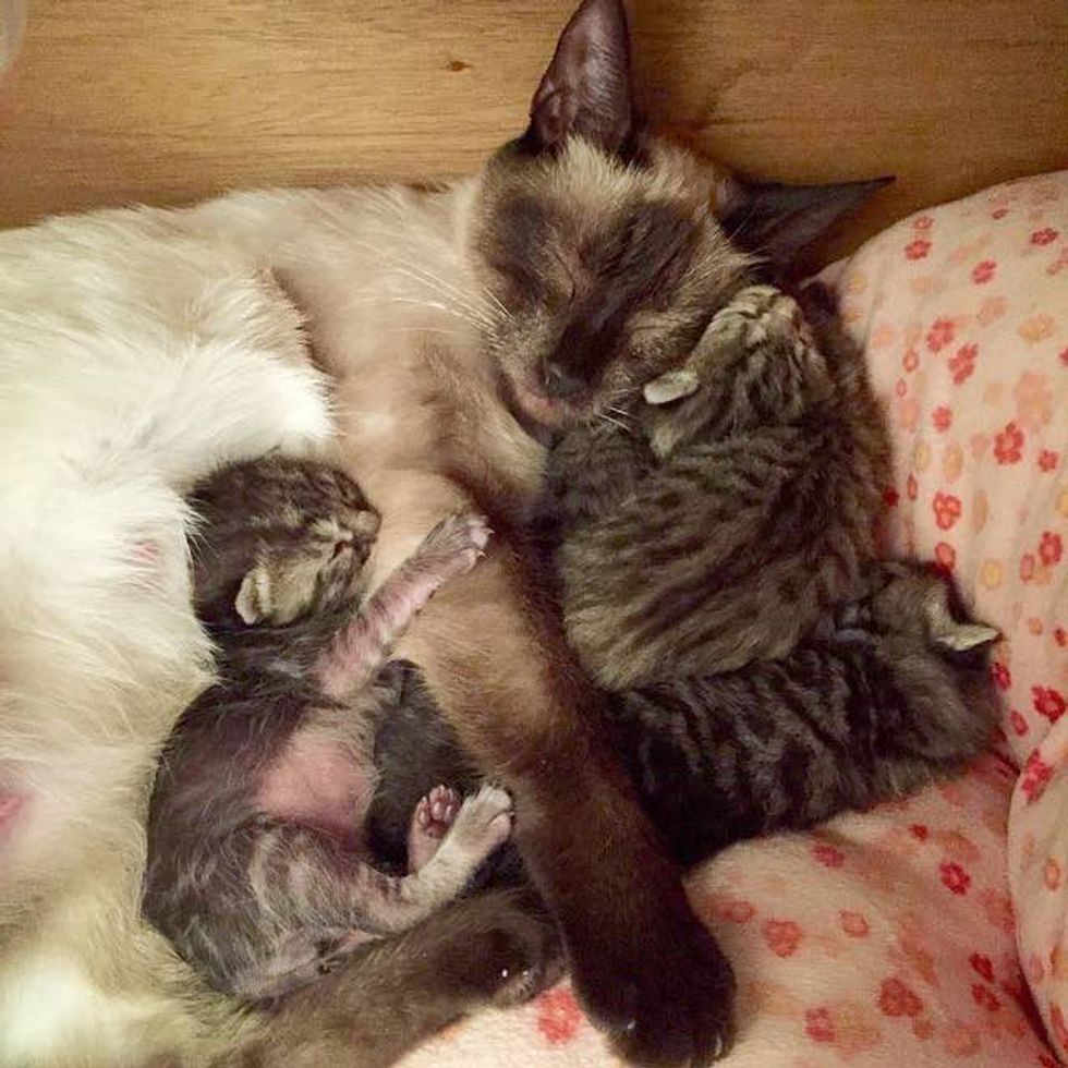 Share this adorable story of Maggie the Siamese mom and her 4 tabby babies.