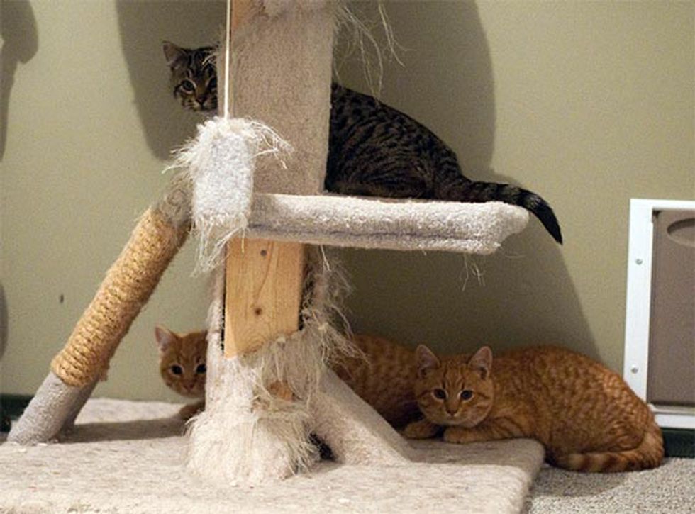 3 of the rescue farm kitties hiding behind a cat tree at their foster home