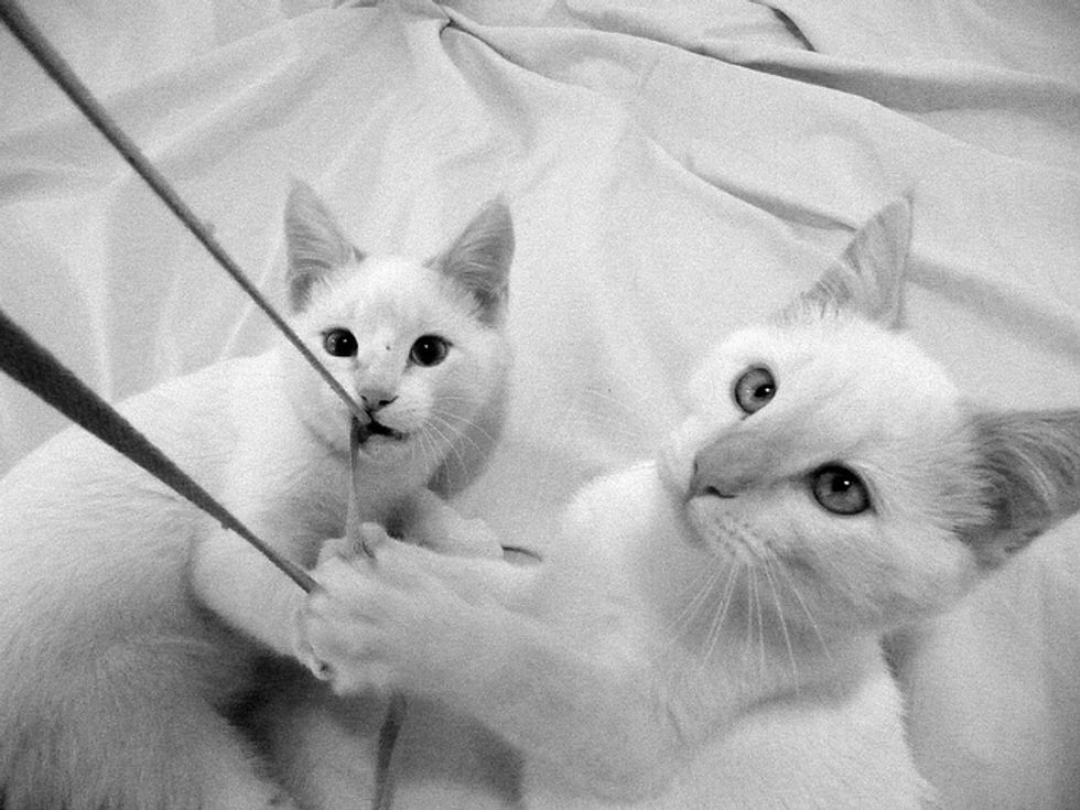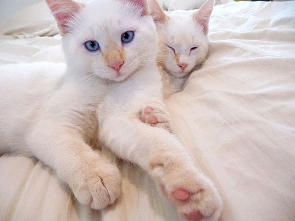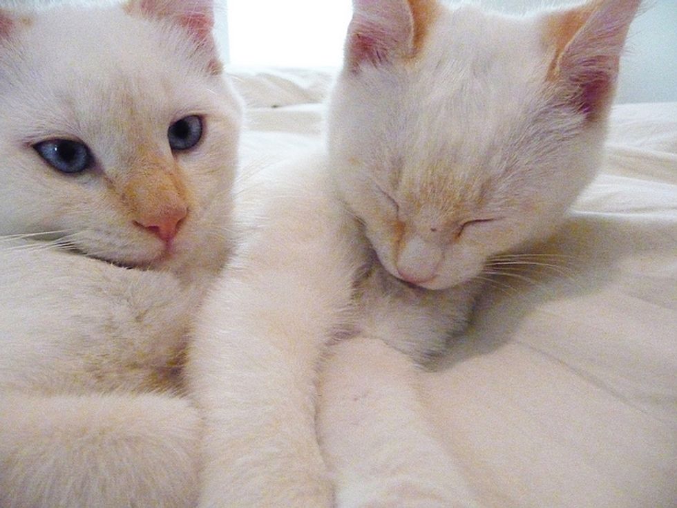 "My husband didn't like the idea of me keeping Mallow (we already had 3 cats) but I told him that I couldn't give him away because he and Stitch were a matching pair. :) Mallow is an independent little guy, but can be a lover when he wants to. Stitch on the other hand has a really unique personality. he is super sweet and when he is happy he walks on his tiptoes like a little dancer. He stands on his hind legs and waits to be petted too. They do cuddle like the photo all the time in winter. Stitch is the one with the bigger head, mallow has the little scar on his nose."