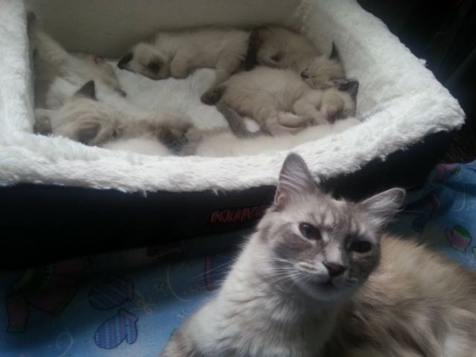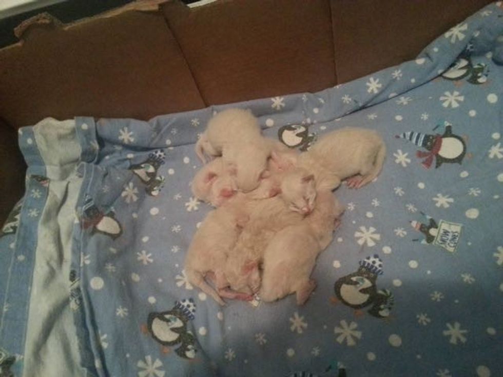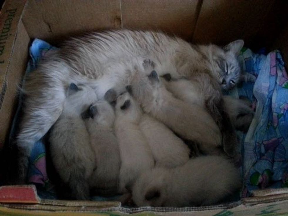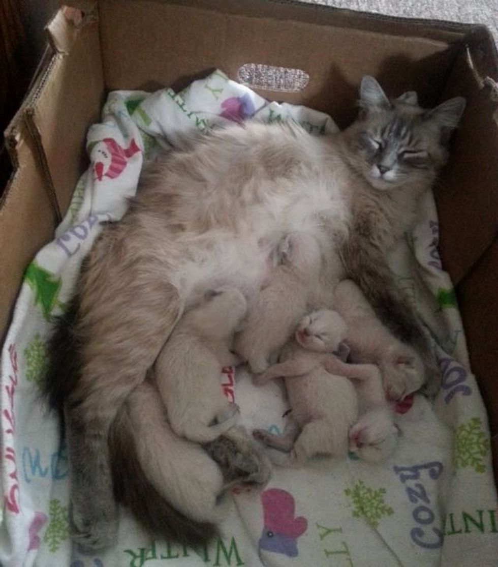 "On May 22, while I was home sick from work, Myrtle went into labor on my bed. Next to me. While I was napping. I woke up to the first kitten being birthed. In the next few hours, she gave birth to seven total kittens."