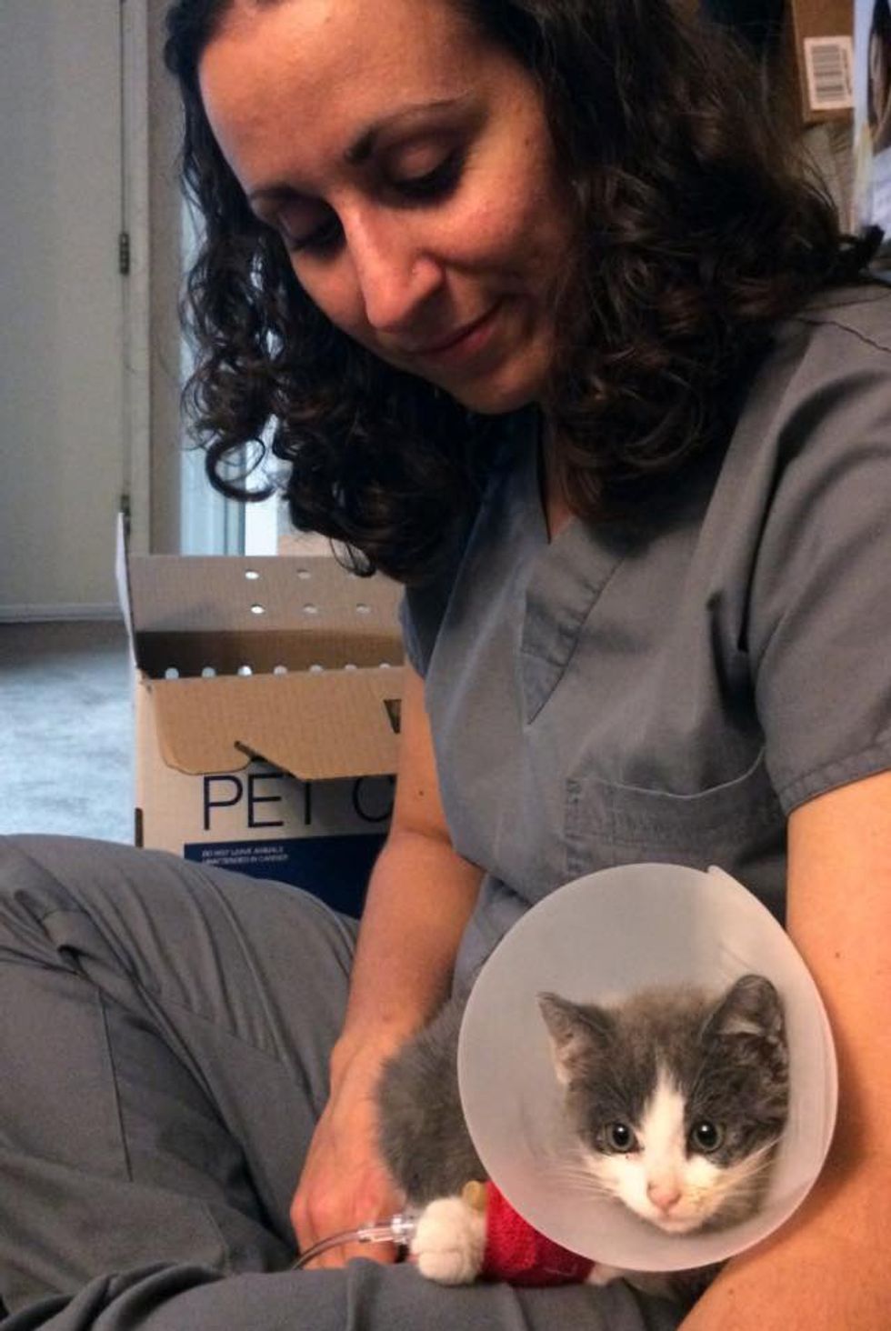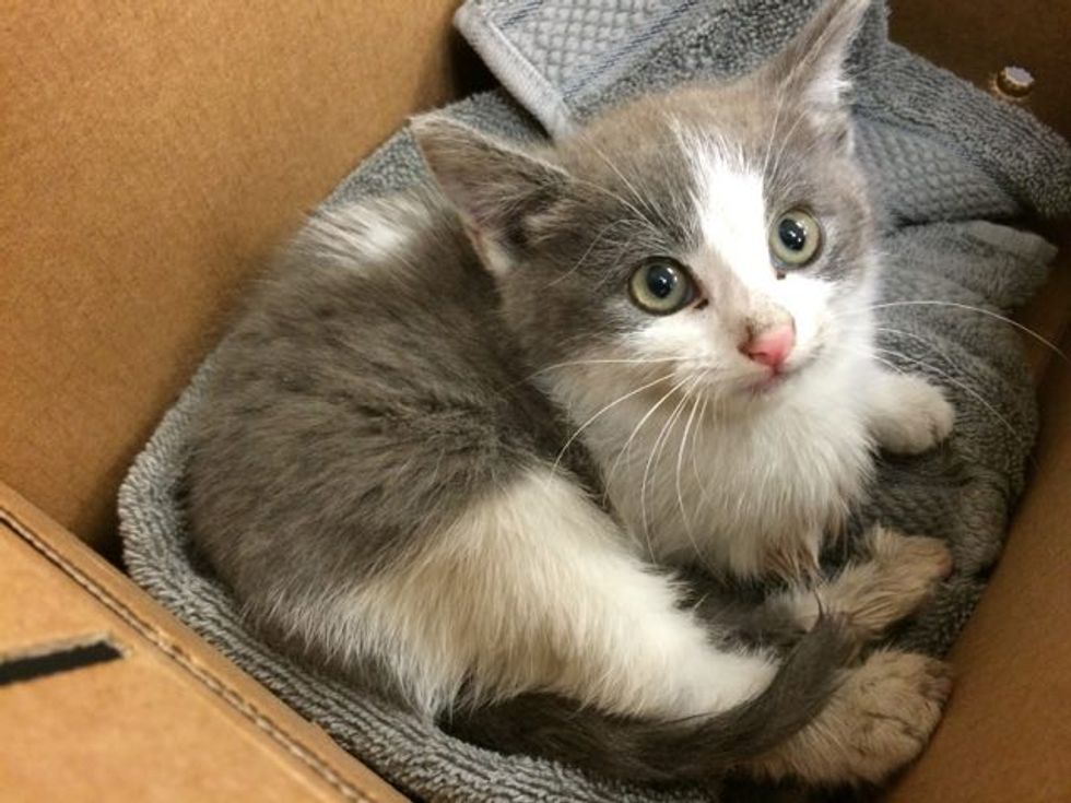 "When I opened the cardboard box that contained the kitten, I saw a little white and gray kitten who promptly hissed at me," Dr. Ostermann of the Tails of a Shelter Vet wrote.