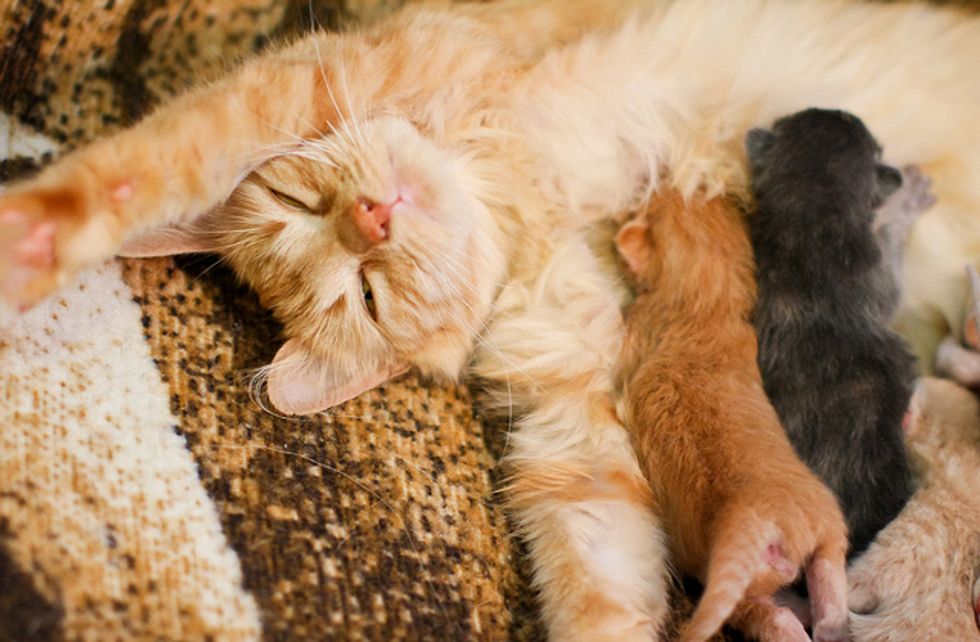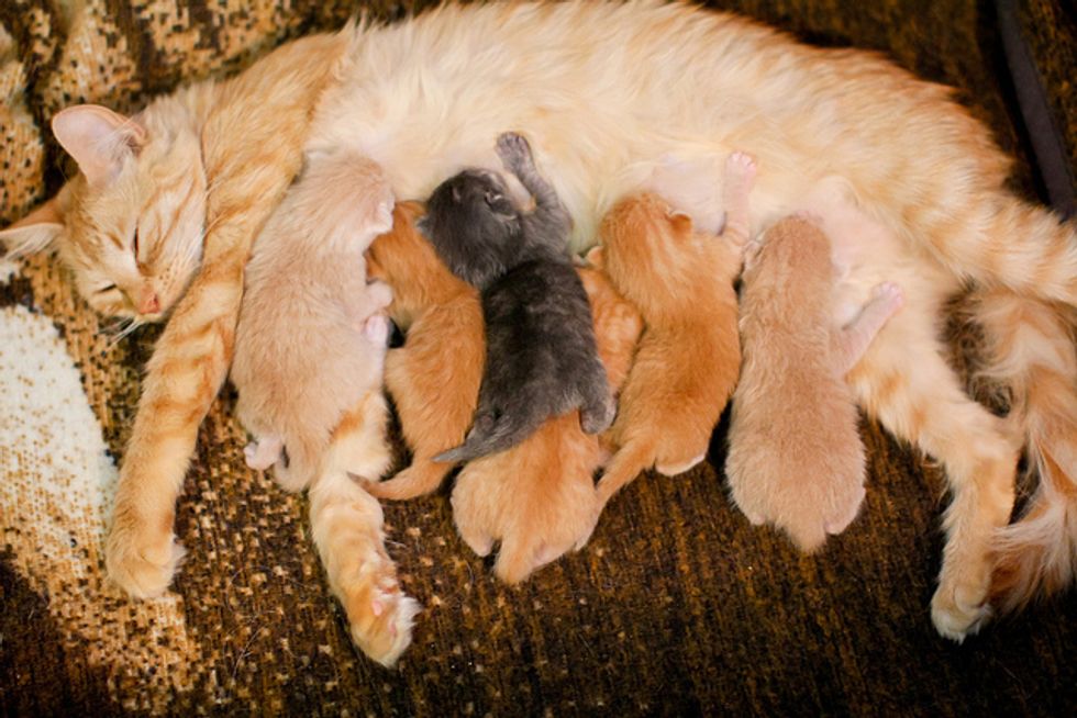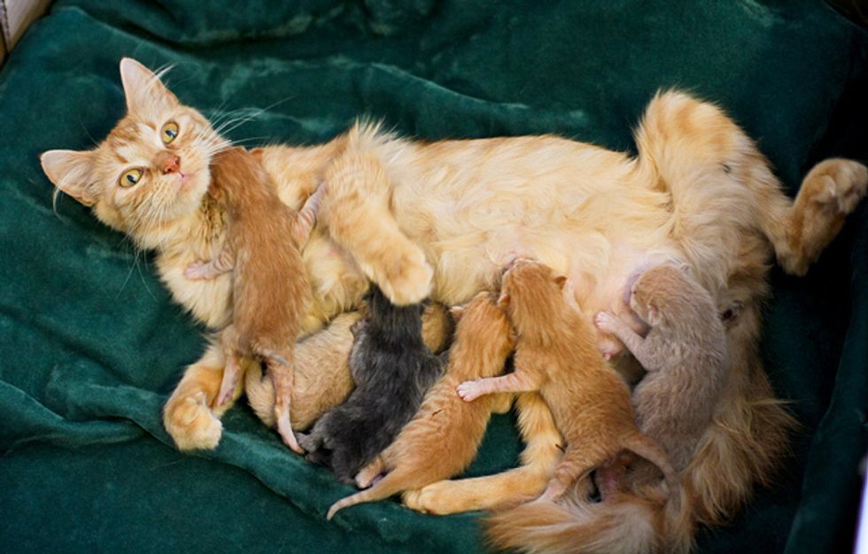The hard part is that Sunshine is a very young mom, probably 8 months old. Shes a sweetheart, but doesn't take mothering too seriously. She is too young to be a mom and she's obviously never been in a house before, this has not been easy for her. But the positive side of that is that she absolutely has no problem with the dogs hanging out with the kittens, so that's been great to have that early socialization.