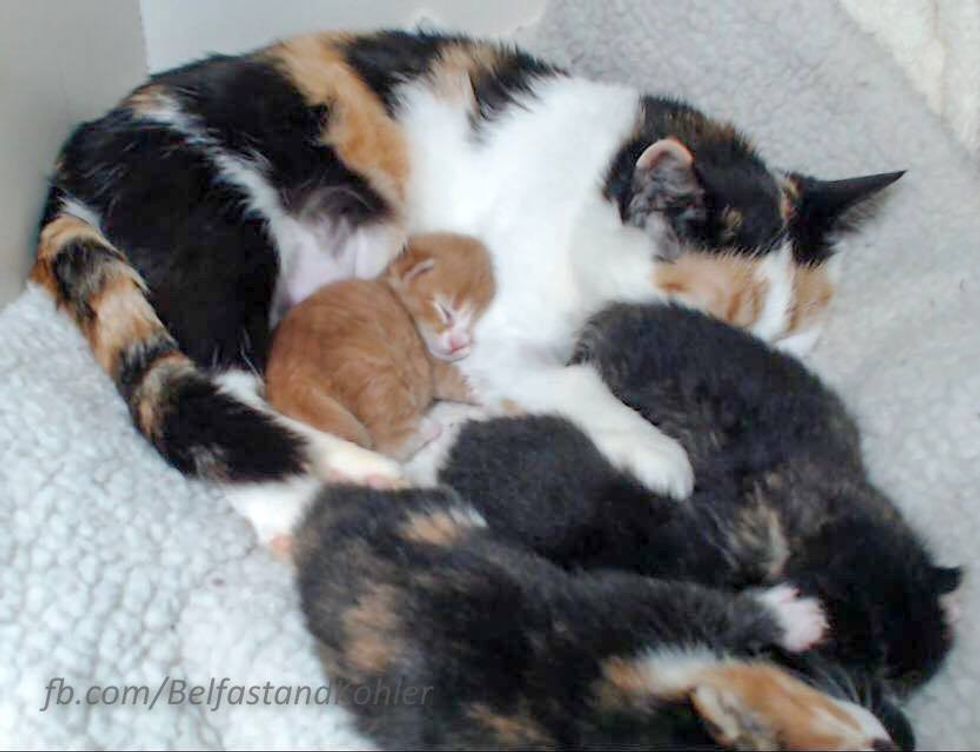 "Little did anyone know, she would need an emergency C-section to save her life, and all 4 of her kittens: the floofy Belfast, cuddly Kohler, dapper Justin, and fabulous Farrah Fawcett!" ( Belfast & Kohler - The Sink Kittens, Jedikittens - Luke & Leia - Luke & Leia)