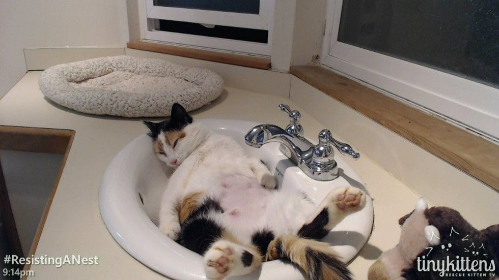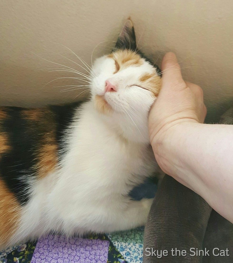 To everyone's surprise, within days, Skye warmed up to her human friends and developed a flair for lounging in the sink of her very own private quarters at TinyKittens.