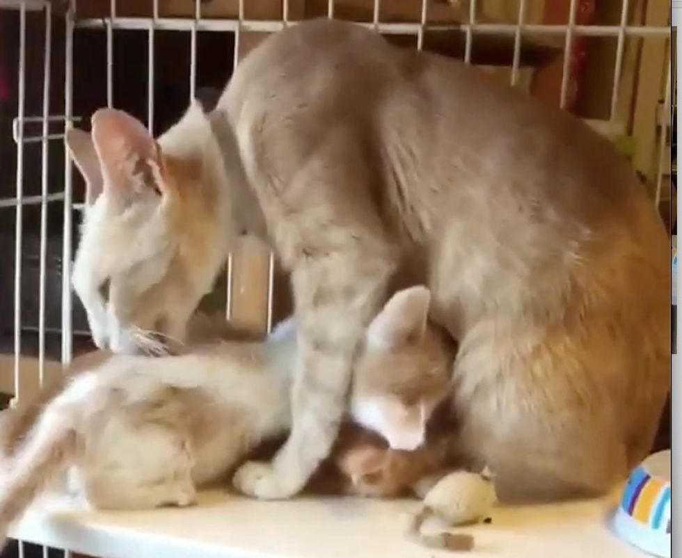 They walked right up to their mom and immediately tried to nurse. Destiny recognized her kittens and started mothering them. She was so happy to have them back by her side.