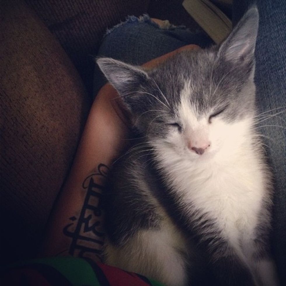"On the road I saw (the kitty's) huge eyes from the side of the road... no question of us not stopping, and despite the bloody nose and broken leg, she bounced back almost immediately and joined our little zoo like she'd been born into it," said lvacqua via reddit.