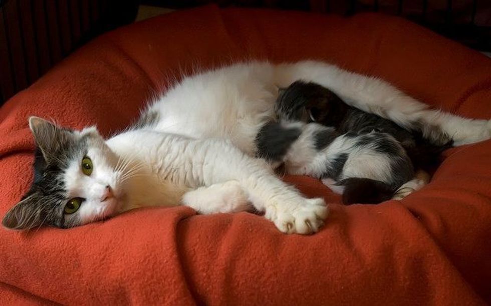 Rose, the little homeless stray cat mama found the right place to have her babies. "Kind cat-lovers helped her out as she was giving birth to her two little offspring," said Robin Olson.