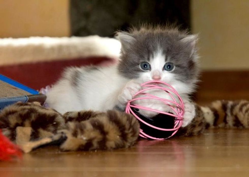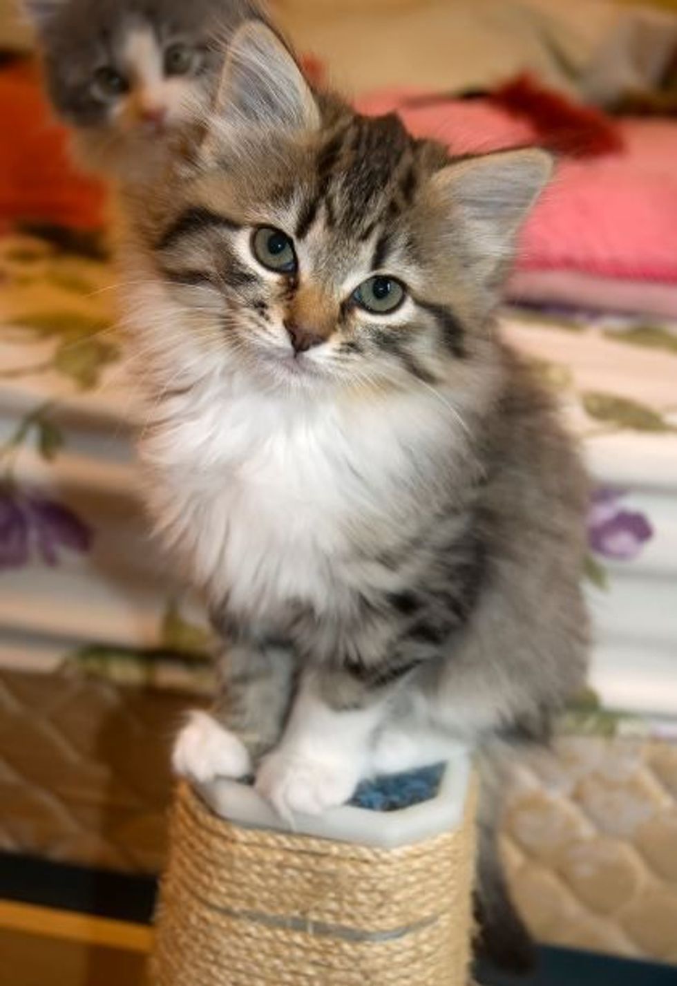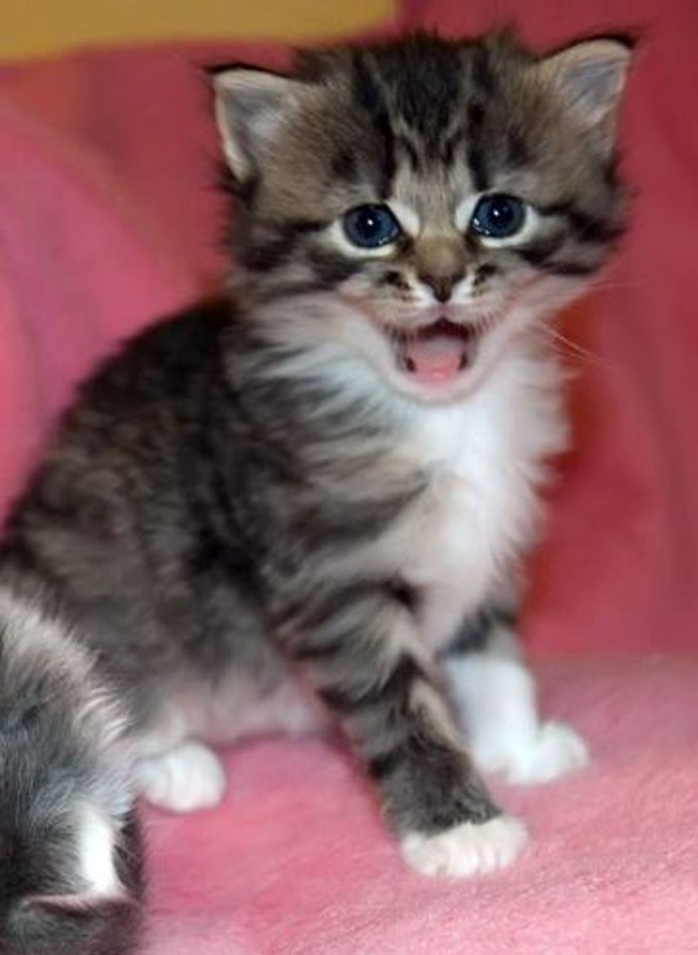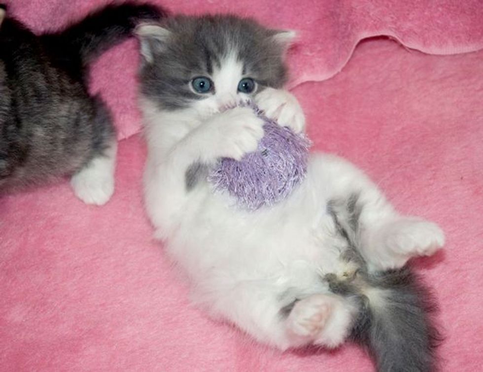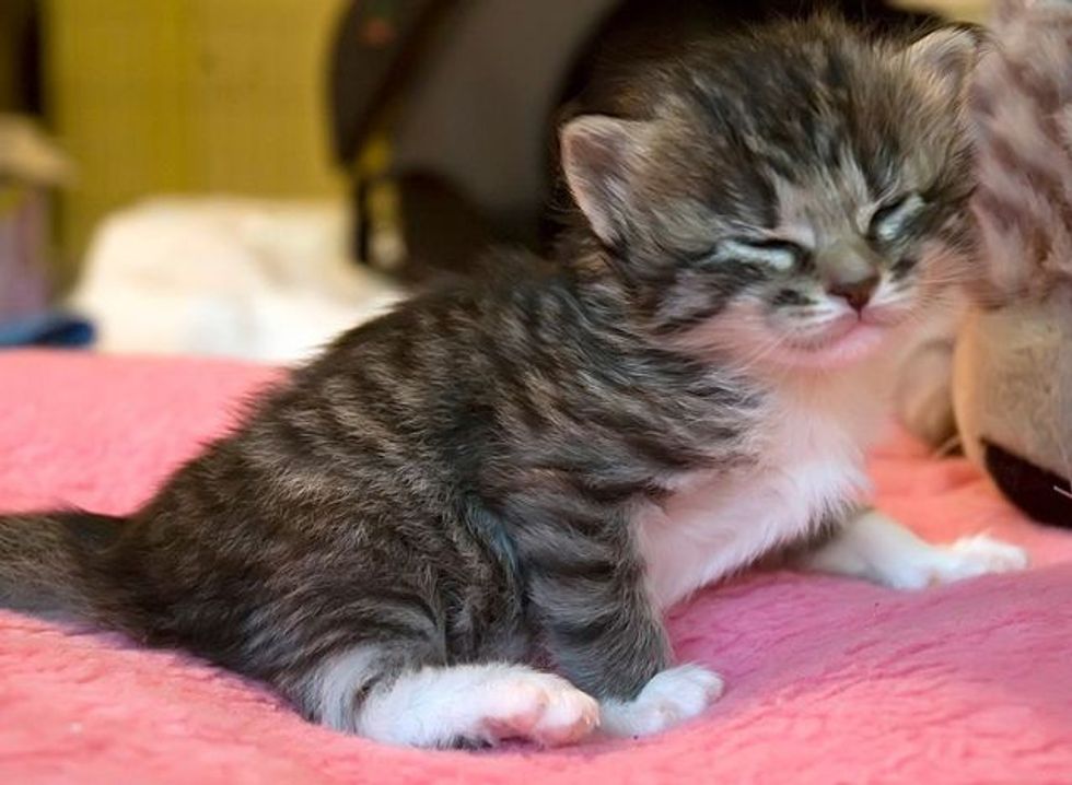 The babies were born on August 1st, 2008. Poppy is the white one with spots and Daisy is the silver tabby with white paws. Just 9 days old Poppy did not have her eyes open yet, but her sister Daisy was already starting to see. They both loved the stuffed cat that Robin gave them and often fell asleep on top of it.