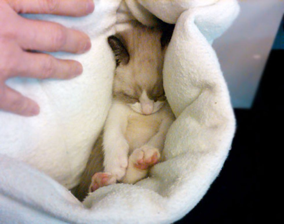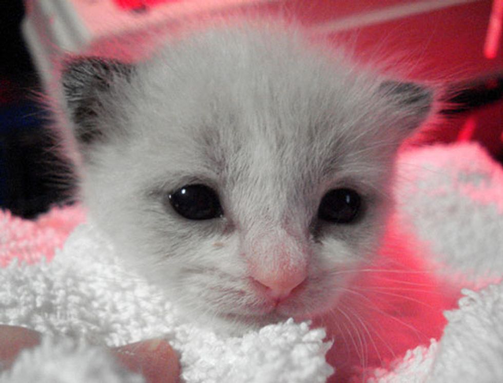 "Rozza was rescued in Greenpoint, Brooklyn. A woman was walking a friend's dog and noticed the dog was carrying something in his mouth. She thought it was a rat, but it turned out to be a tiny kitten less than a week old... The woman rushed him to the vet who told her to get a bottle and formula and try to feed him. When she went to Muddy Paws for supplies, Robin referred her to me. I took him in and have cleaned him up, removing the fly eggs from two wounds...," said Lisa Vallez, animal rescuer from Brooklyn, New York.