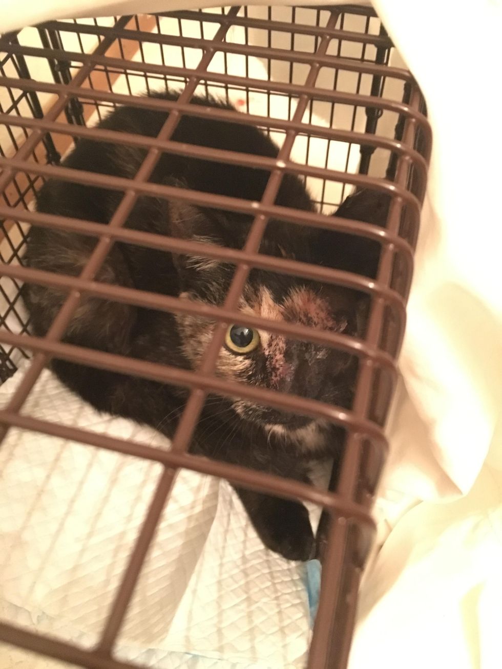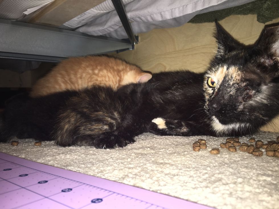 The tortie mama had foxtails in one of her eyes which caused it to rupture. After an emergency trip to the vet, they had it removed and mama was on the mend. They named her One-eyed Sally.