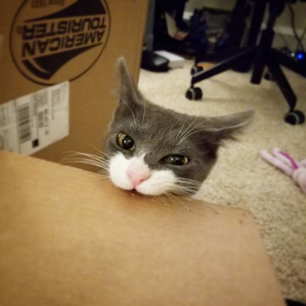 "The wild Small Fry in her natural habitat has slain her prey, a cardboard box. She is a ferocious hunter, killing several boxes each week primarily for pleasure."