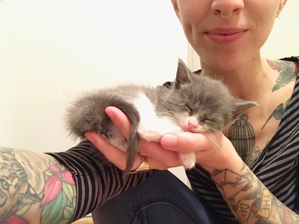 She went to Humane Rescue Alliance in Washington D.C.. While she was there, she was shocked to discover just how emaciated and underweight the little runt was. Her name is Small Fry and she only weighed about 170 grams at three weeks old (the size of an one-week-old kitten).