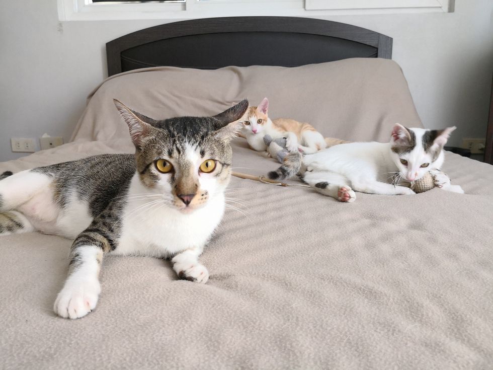 The older cats have taken their new brother under their wing, sharing their kingdom together.