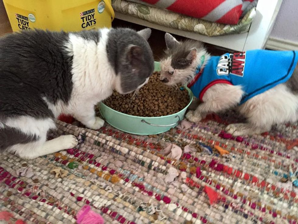 Pappy sharing food with 13-year-old blind kitty Hammond.