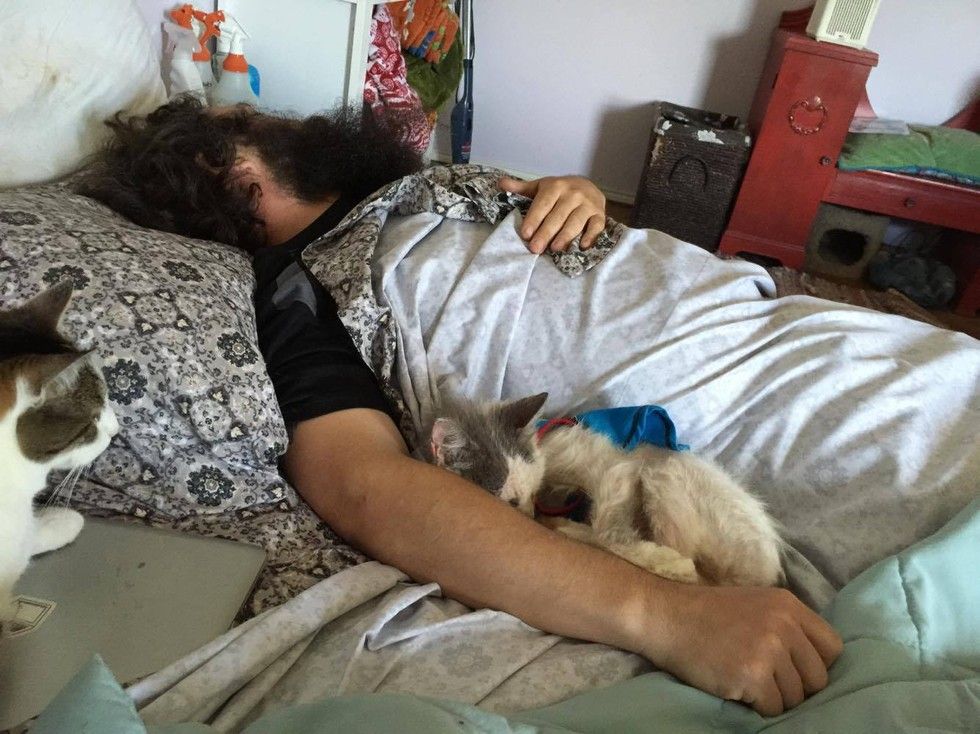 Pappy the cat was found as a stray by animal control. Karyn Poplin of Kitty Adventure Rescue League (KARL) rescued him and took him into her cat sanctuary in Fort Worth, Texas. Even before they got home, he was already showing so much affection.