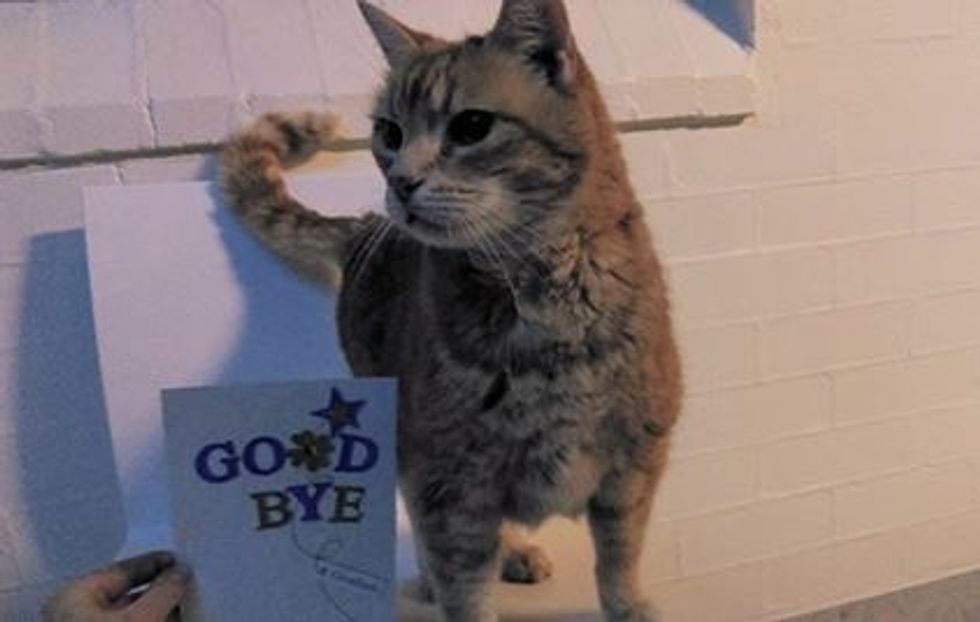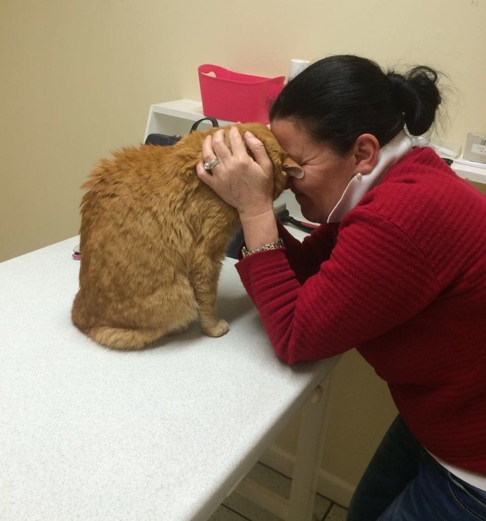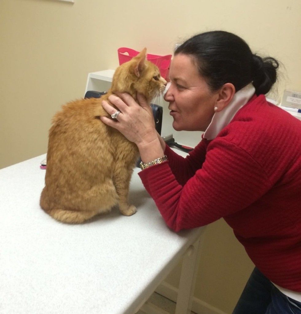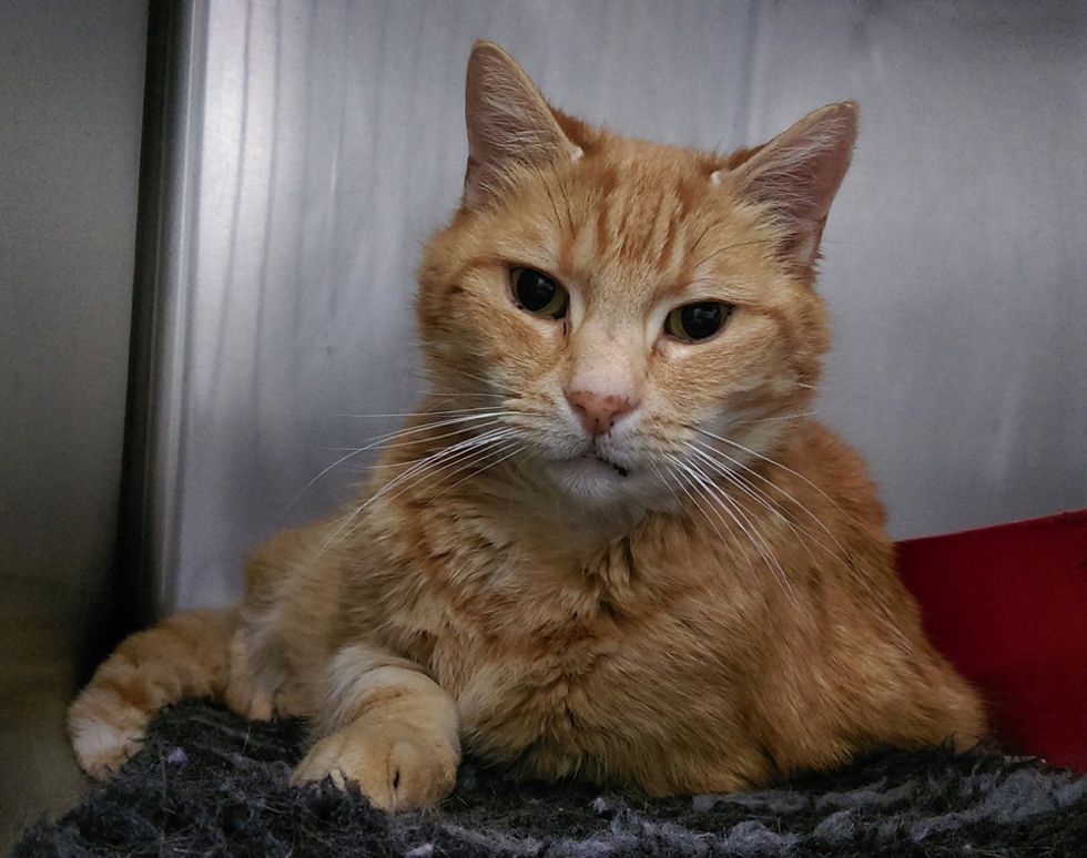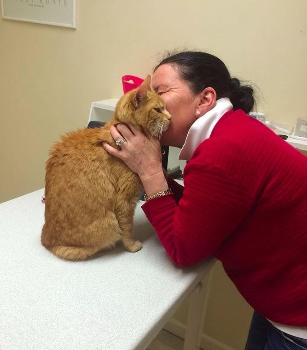Some good Samaritans spotted the senior cat and brought him to a local vet clinic and tracked down his owner through a microchip. The tiny cage at the vet's became his new temporary home.