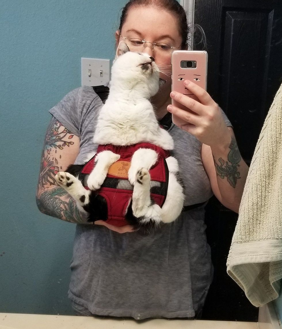 "So, naturally, I bought a carrier to keep her happy and in place so I can get things done. I got a medium, thinking that would be plenty to fit, except it's supposed to zip up the sides...," Karyn told Love Meow.