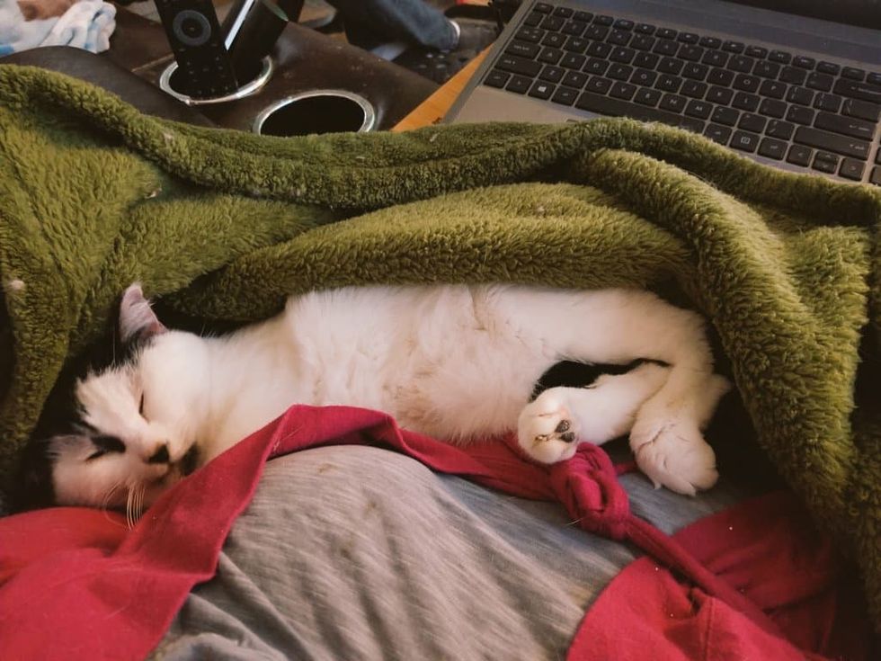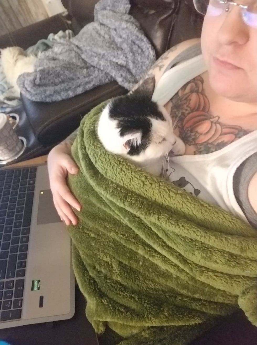 Karyn is switching between a blanket and Squishy's very own carrier to keep the kitty where she wants to be.