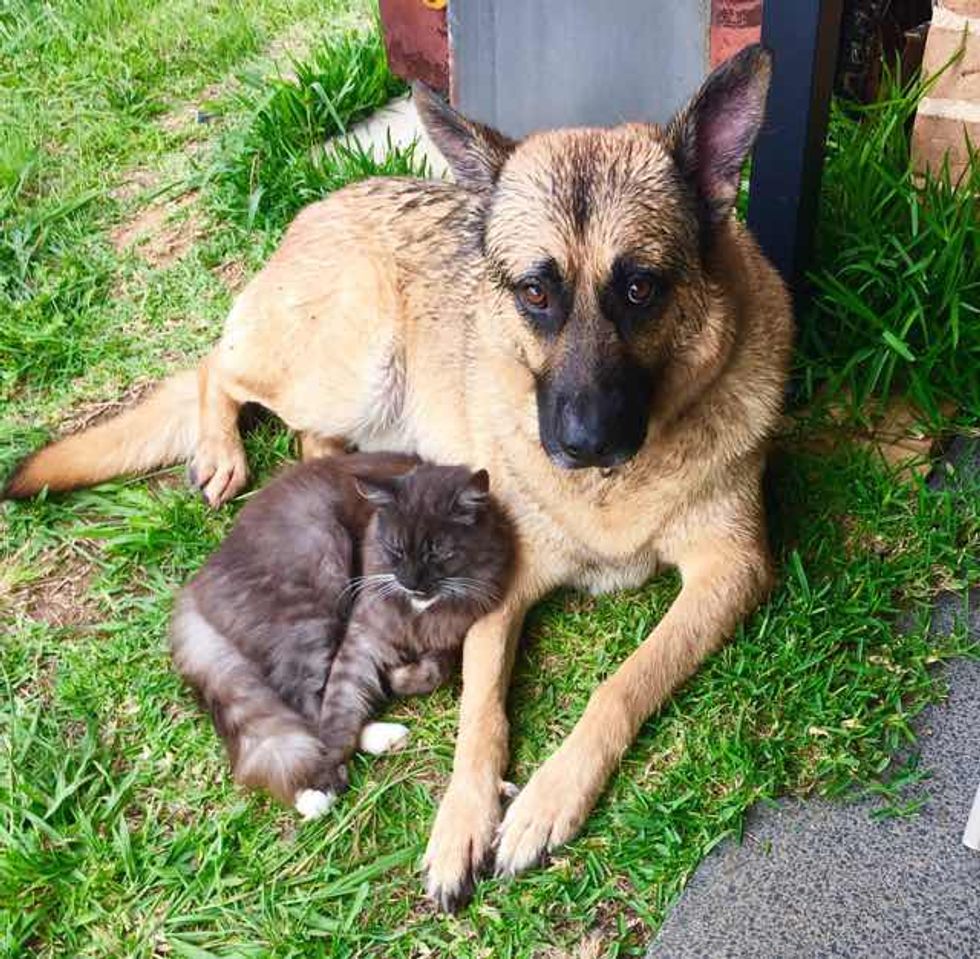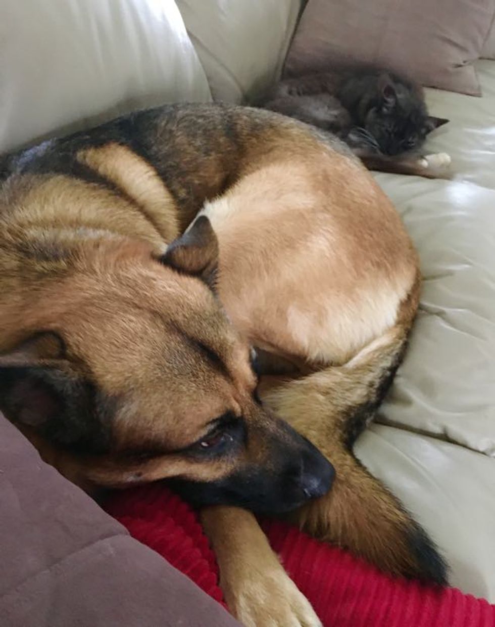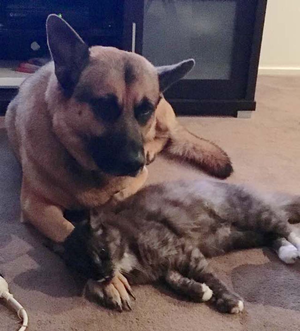 "Four years on and they still occasionally play fight but mostly cuddle. Smokey will commonly go and snuggle up with Kaiser. They're the cutest. Kaiser is very aware he is a lot bigger, and is very gentle with Smokey."