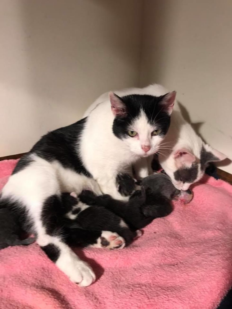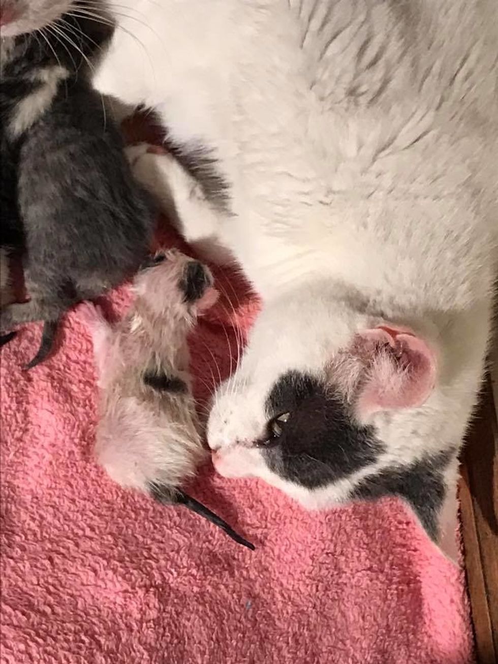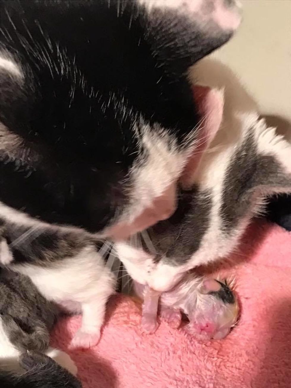 Jessie lay down next to Esther and proceeded to birth her kittens. Esther stayed by her side during the entire process and even helped wash the newborns.