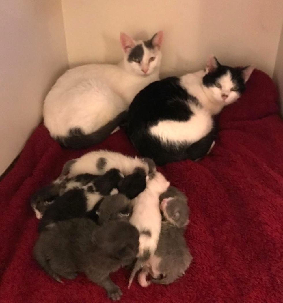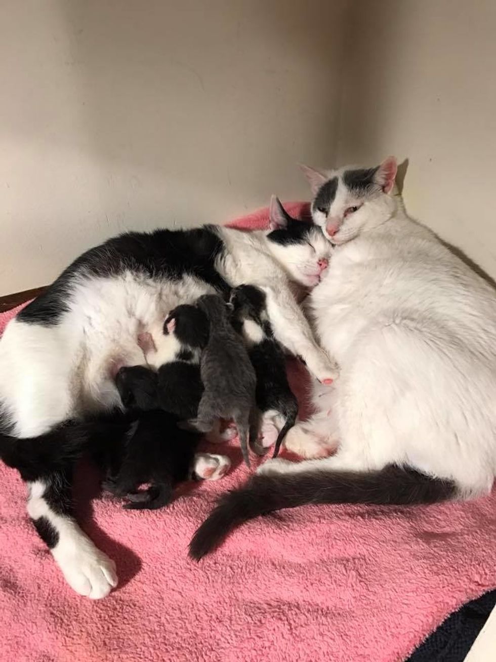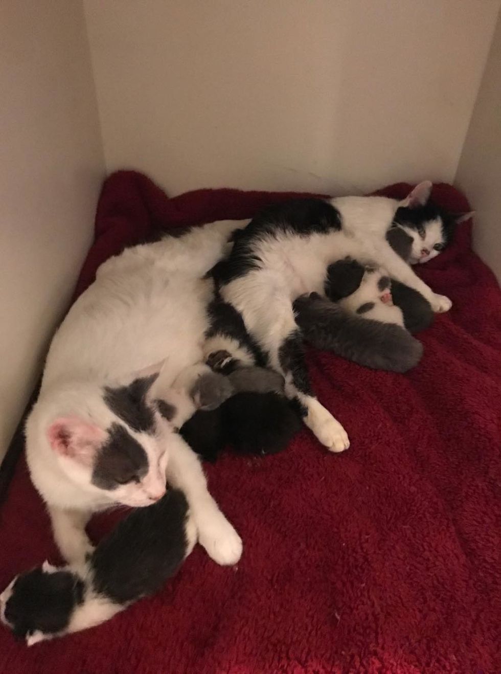 After successfully giving birth to four healthy kittens, the two mamas decided to stay together along with their combined nine babies.
