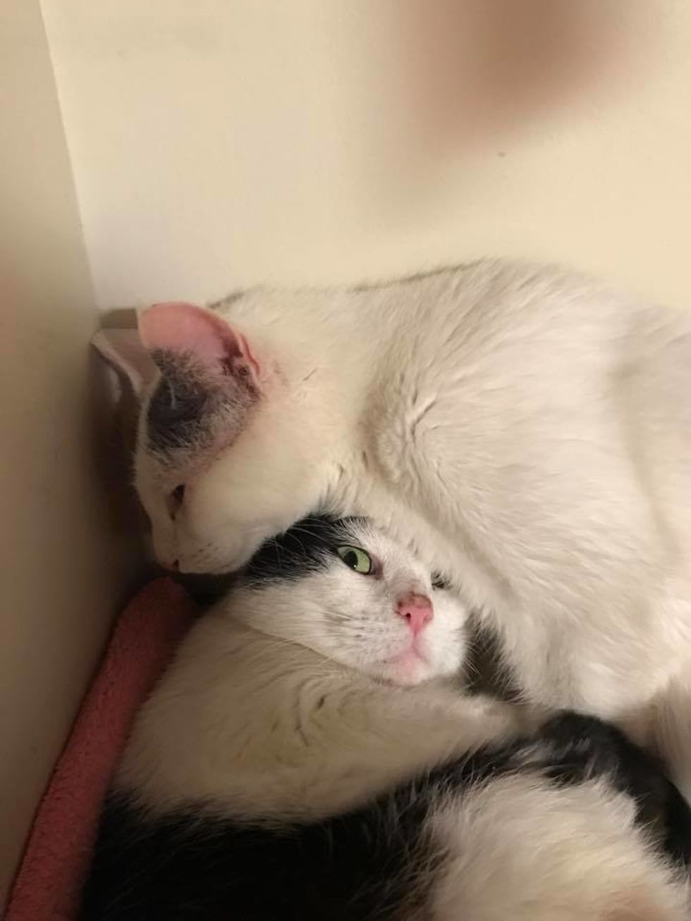 Esther had her kittens first last week, and when it was Jessie's turn, she turned to her roommate and snuggled up to her for some much-needed comfort.