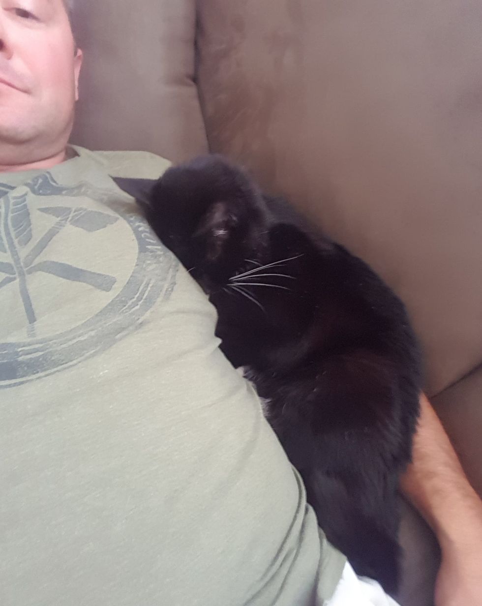 Sammy quickly adjusted to his new abode. He was eating and using his litter box with no issues. The tuxedo boy followed Tim around the house and wouldn't leave his side.