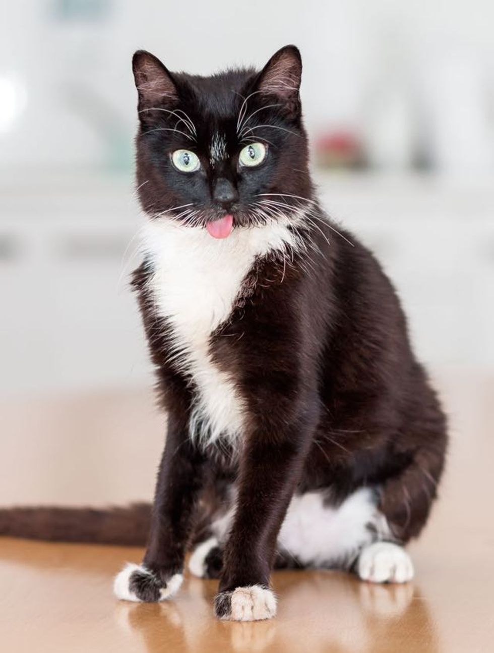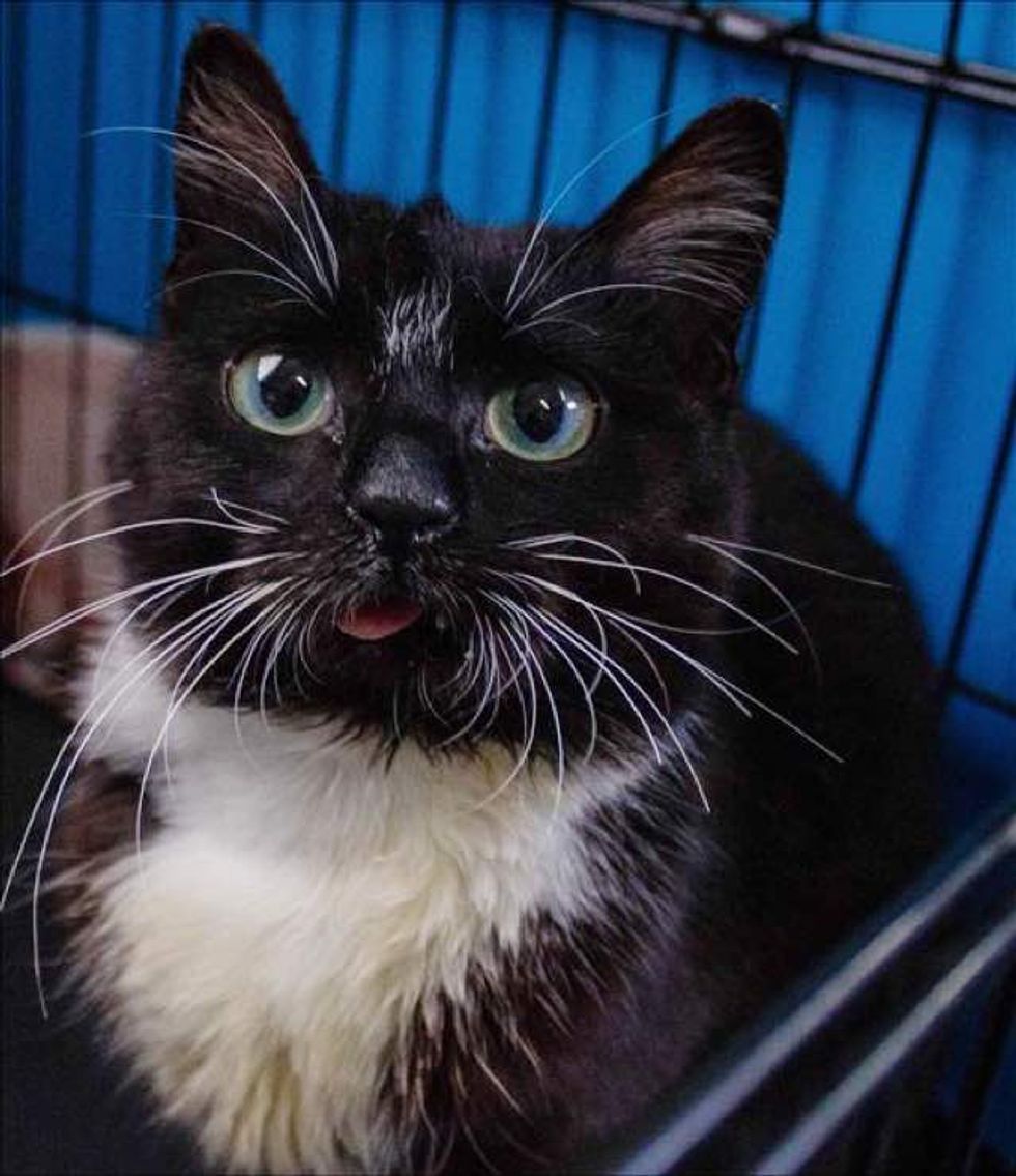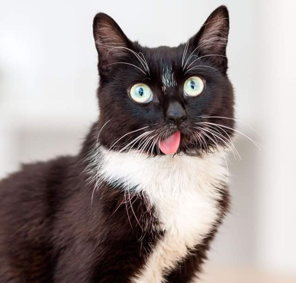 Her name is Jaws. She can't keep her tongue in but she's truly the sweetest cat. At 2 years old, Jaws was found as a stray. The little tuxedo is missing her jaw, but she's made due with what she has like a champ.