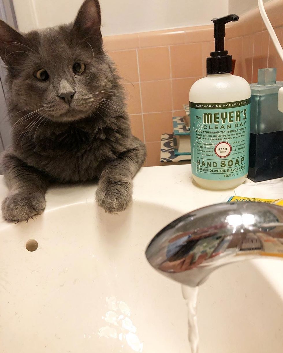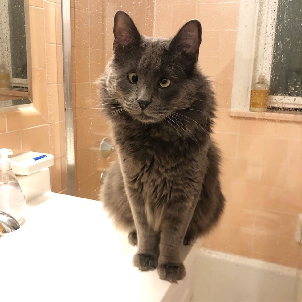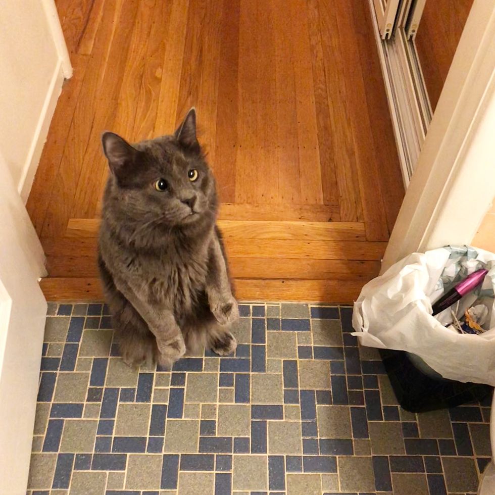 "He's also great at cat activities like pushing things off counters and does that with the bathroom counter, without fail."