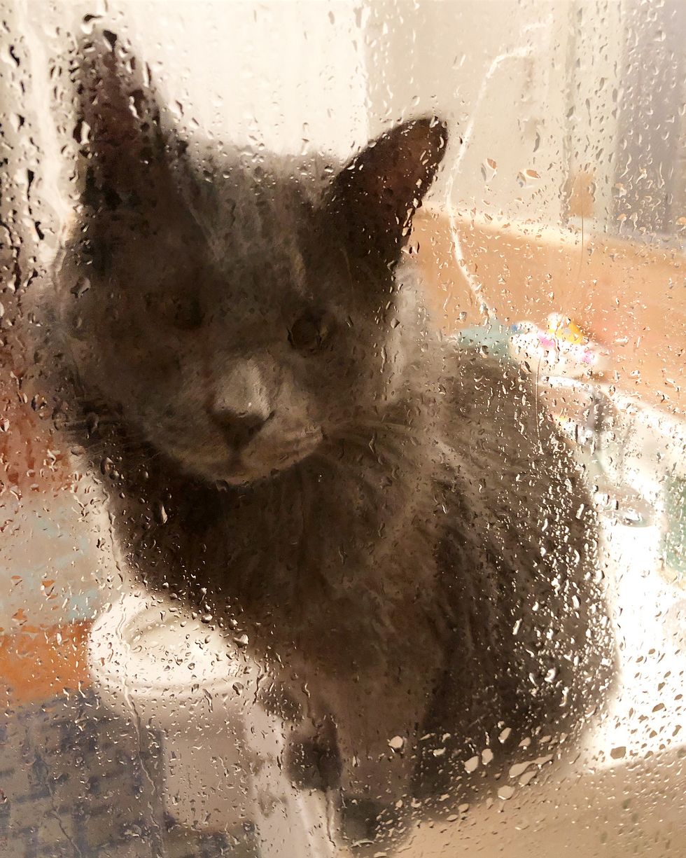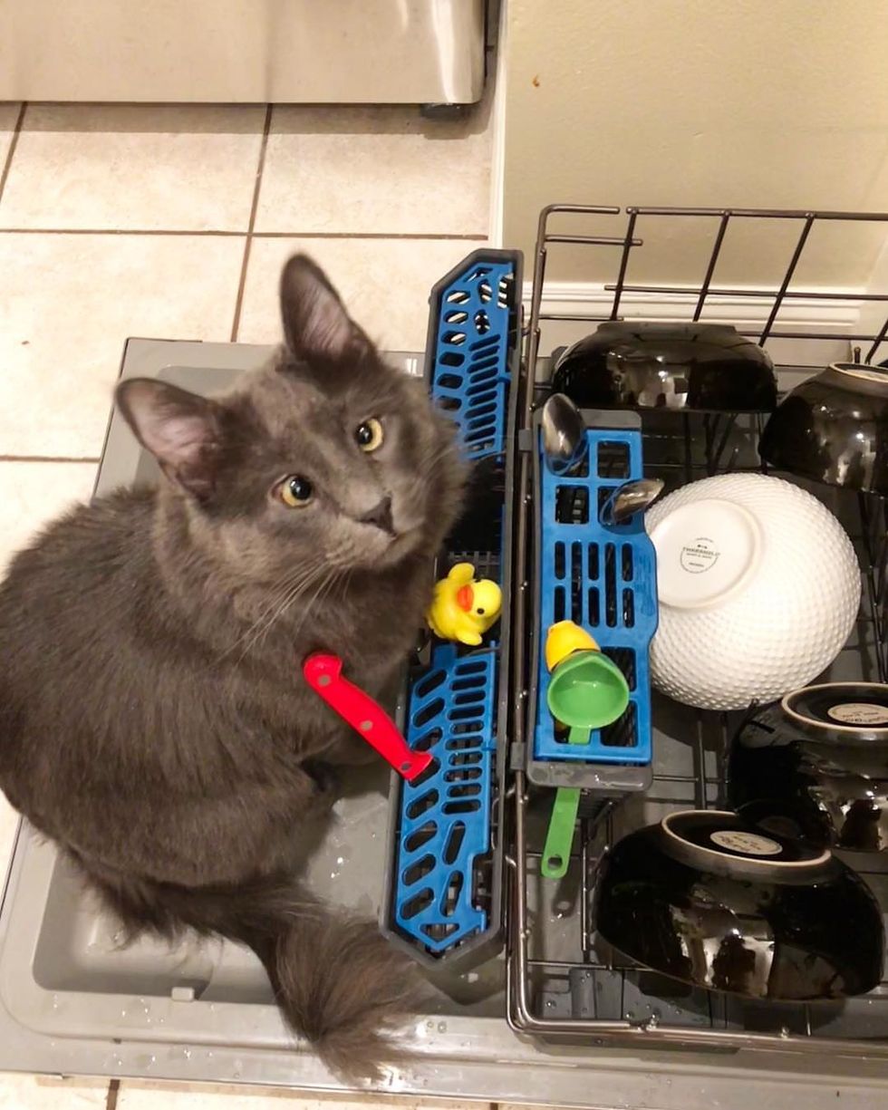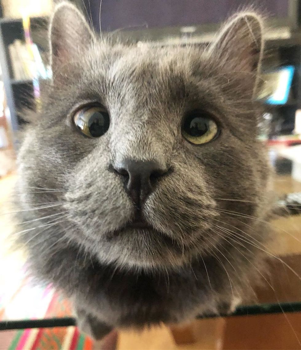 "He's also great at cat activities like pushing things off counters and does that with the bathroom counter, without fail."