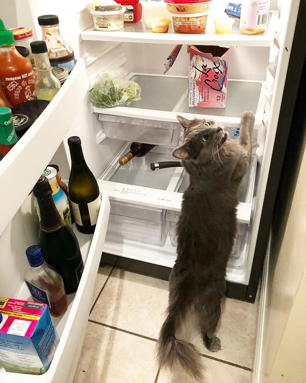 Belarus inspects his humans' fridge and food choices. He is not shy of voicing his opinion.