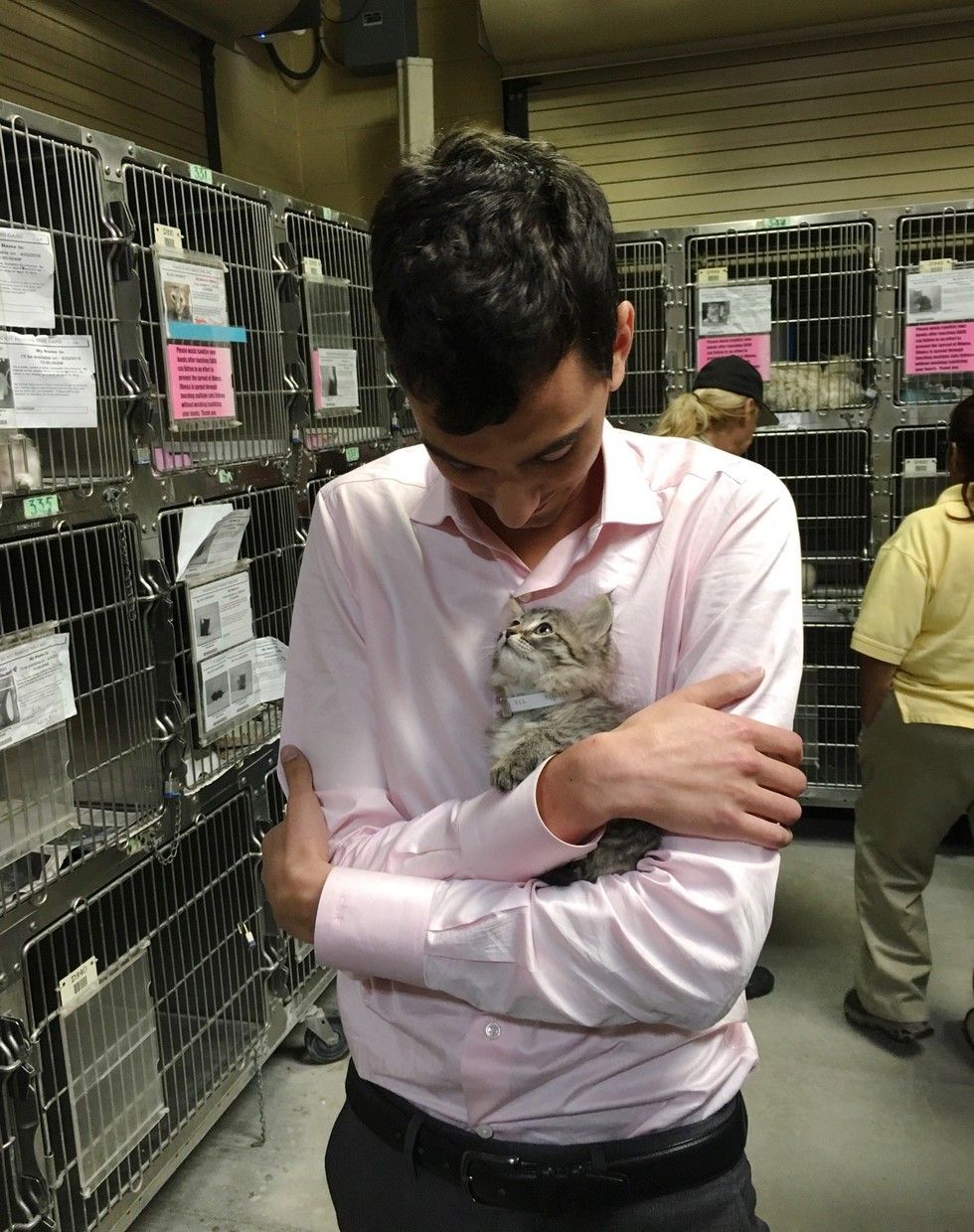 The man went to a shelter in Downey, California and had his heart stolen by a tiny feline friend.