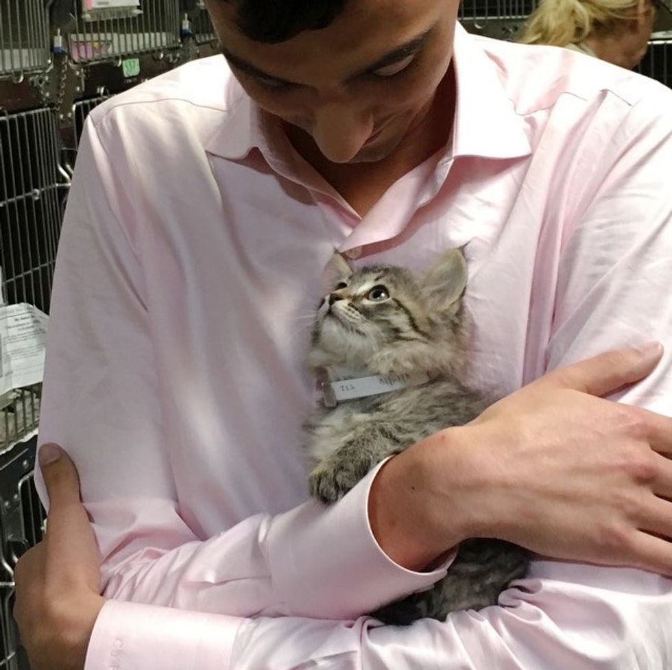 A tiny shelter kitten jumped into a man's arms and looked into his eyes as if to tell him to take her home.