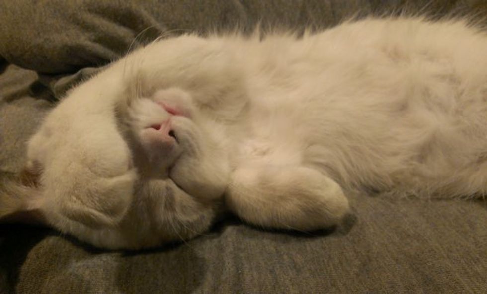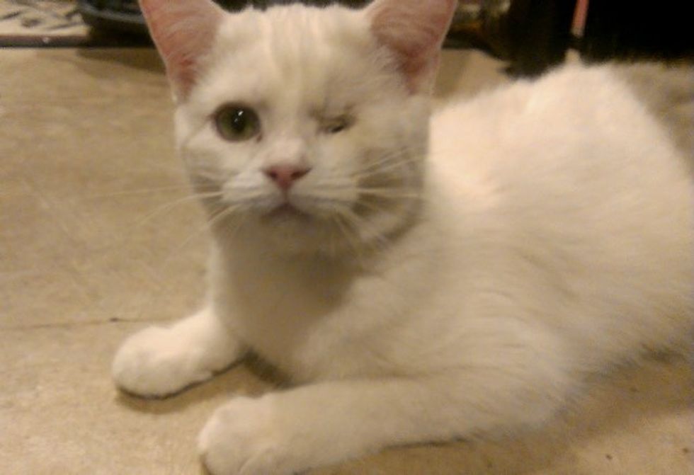 When the guy was getting cat litter for his other kitties, he spotted the one-eyed cat. "I didn't even see his missing eye at first. Just an affectionate boy sticking his paw out of the cage."