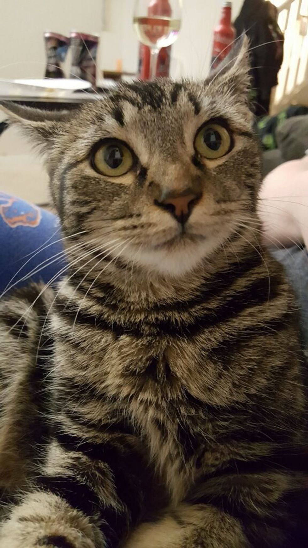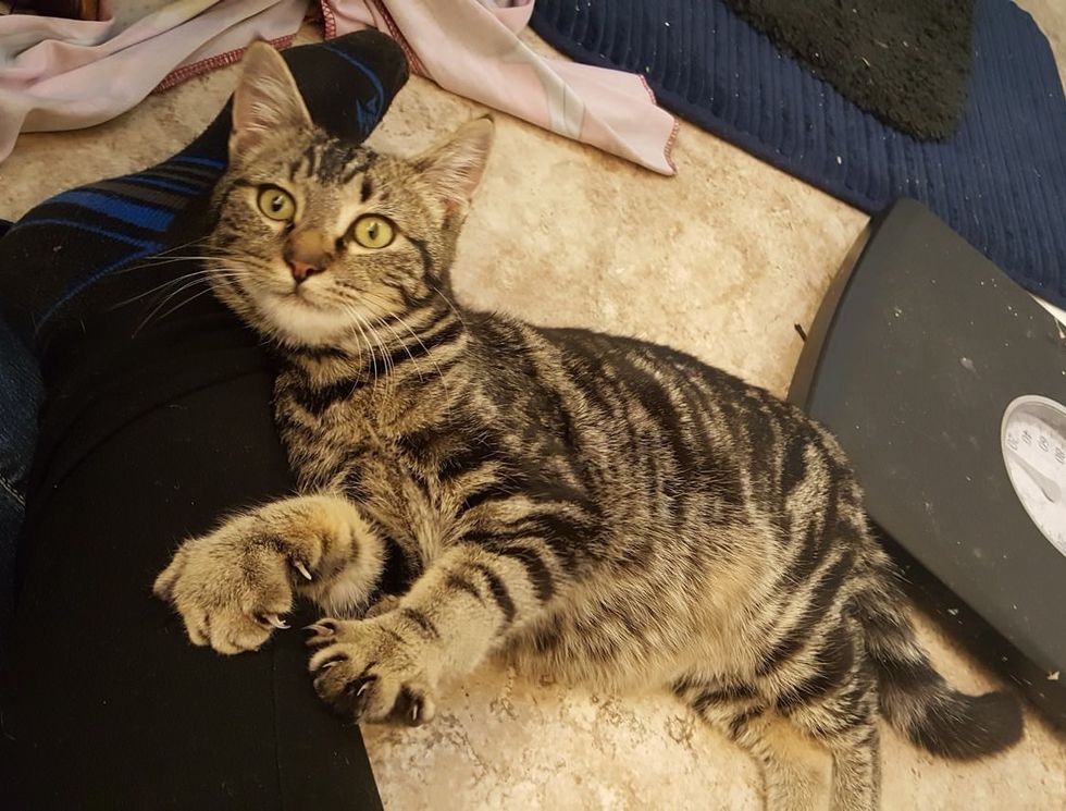 "She settled right in with her five new humans, three new kitty siblings and one pupper. Husband's coworker took her to the vet the next day to get checked out, no chip, not spayed, took a blood sample to test for FIV," RavenPuffFTW said.