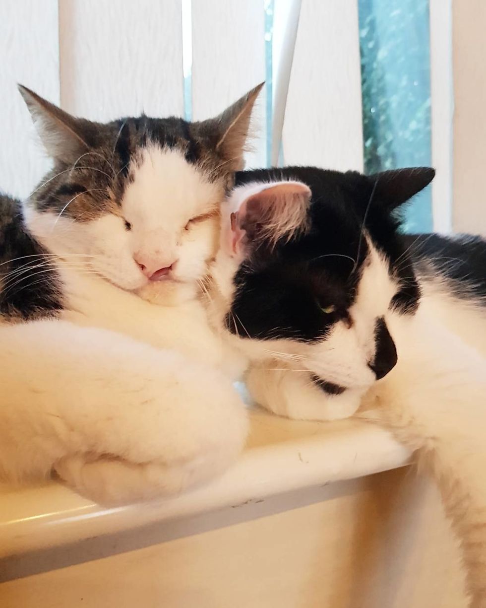 It didn't take long for Bruce to start cuddling with his feline brothers.