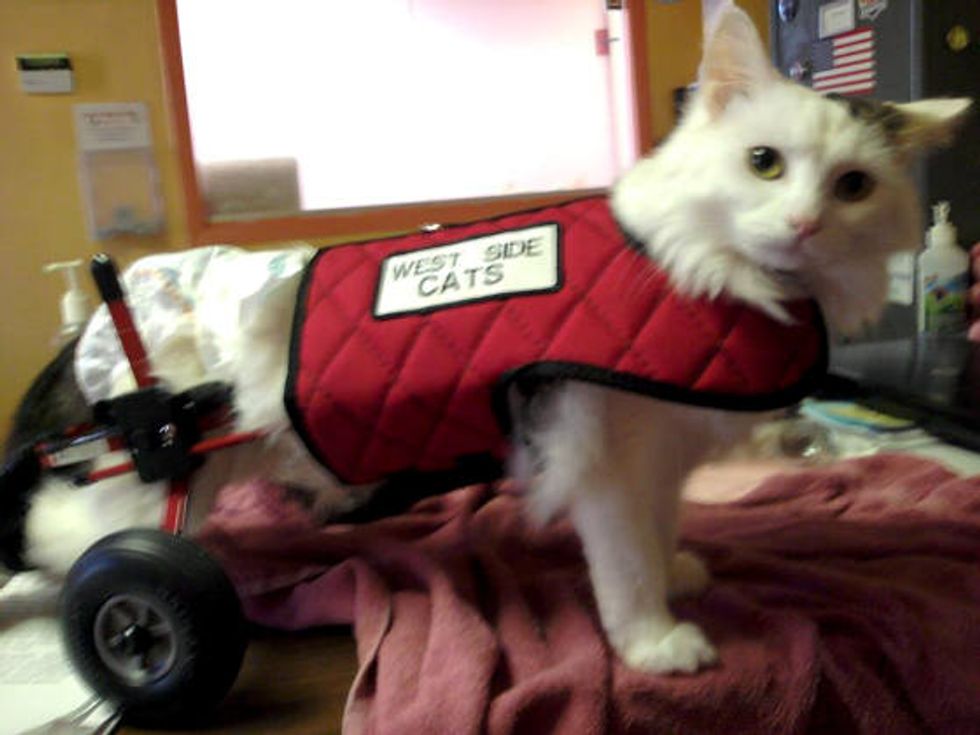 Thanks to West Side Cats, Smoochie was given a pair of wheels so that she could move around again. It changed her life forever. The pure joy she shows when they put her in the wheelchair is as if she never had the disability. She runs around and plays just like any other kitties.