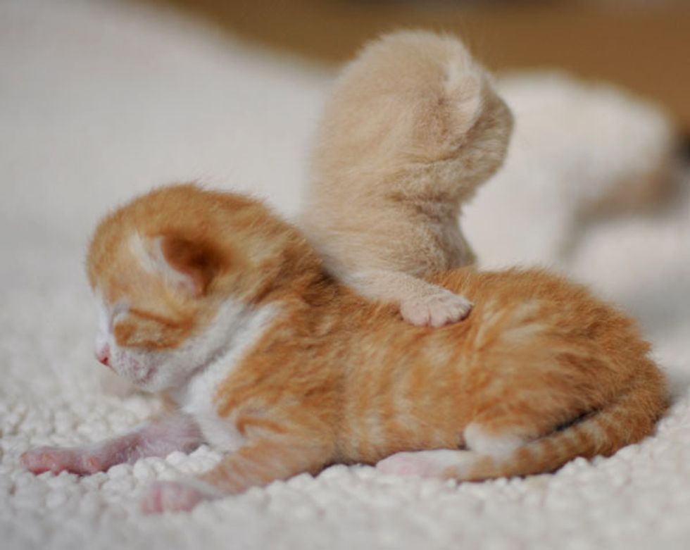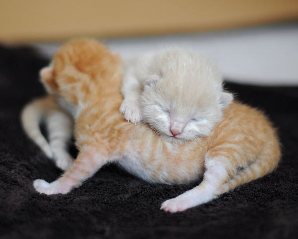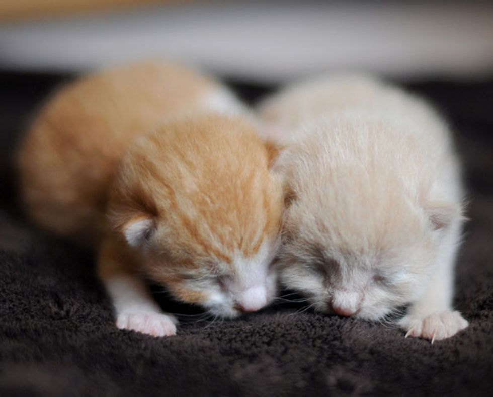 Dash (ginger) and Finn (cream) were born to a stray mama cat who was taken in by the Humane Society. Lindsey helped the mama deliver her babies. The two little buddies are now one week old and growing so fast! Soon they will see the world for the very first time. Until then, here are some photos of this pair of cuddly brothers:
