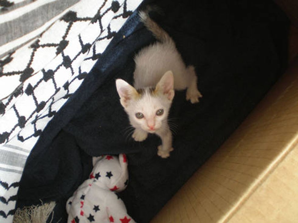 At the time, Jarrod's job was to patrol off base for about 14 hours a day despite the weather. During one of the very bad sandstorms, Jarrod discovered a tiny ball of fur covered in mud squirming around in a pile of trash on the side of the road. The next thing they saw was a tiny, starving kitten crying for help. She was very filthy and could barely stand. They immediately brought her to safety in their truck and had her cleaned up with a few bottles of water. It was then they realized that she was a gorgeous white kitten.