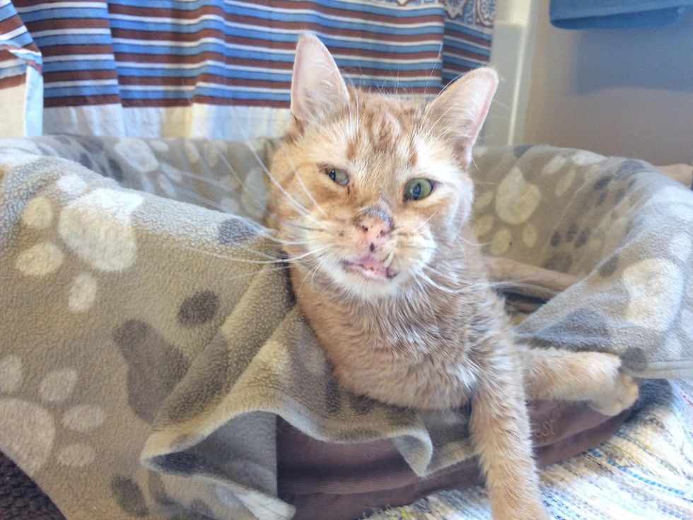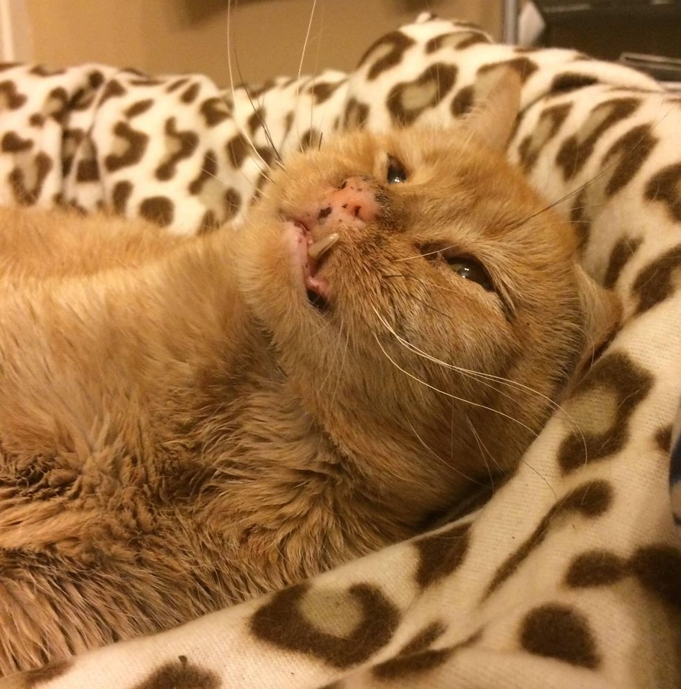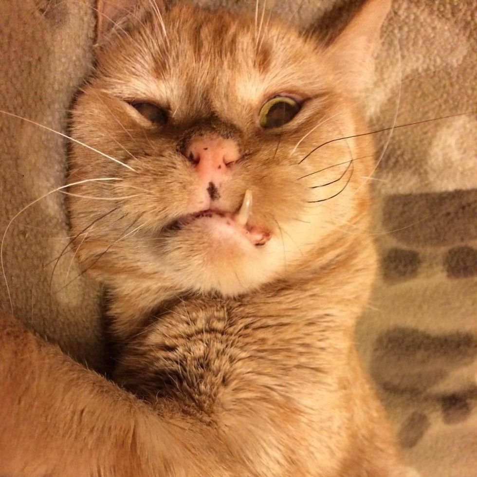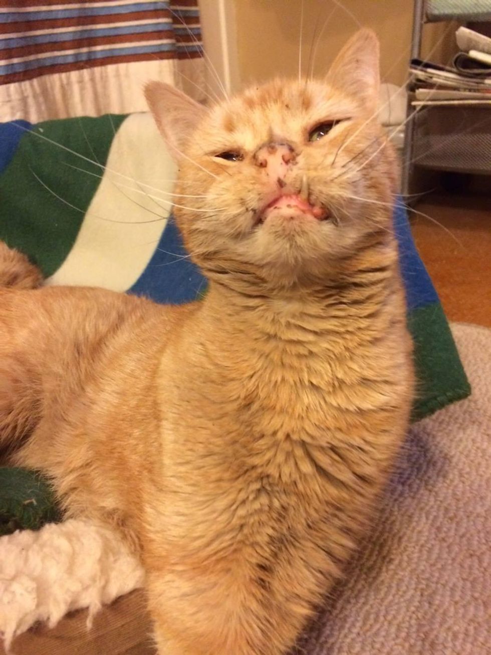 "Herman is a sweet and happy orange tabby with Cerebellar Hypoplasia, or CH," Milo's Sanctuary said. "CH is a neurological condition that affects motor coordination. Herman also has a deformed jaw, which accounts for his famous 'toof' that juts out on the lower-left side of his mouth. He may also be partially blind."