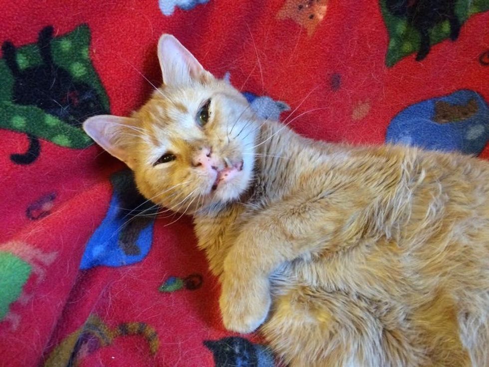 This orange cat is quite special. He has a crooked bottom jaw, one snaggletooth, and is so wobbly that he can't walk, but Herman never stops smiling and purring. All it takes is a second chance.